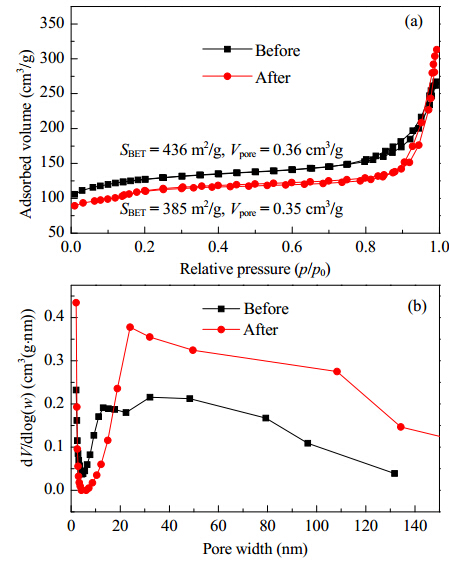 To clarify the pore structure development of HSZs-t, N2 adsorption-desorption isotherm characterization was conducted for HSZs and ZSM-5. As shown in Fig. 2(a), ZSM-5 exhibits a representative type I isotherm, which reflects its microporous structure. HSZs-t (especially HSZs-120), show type II isotherms with a H3-type hysteresis loop and a steep increase for 0.7 < p/p0 < 0.95, which suggests the presence of large mesopores. Fig. 2(b) shows pore size distributions of the synthesized materials. For sample HSZs-120, a broad peak over 10-80 nm is present. In comparison, conventional ZSM-5 shows no distinct mesopore distribution because of the absence of sharp uptake at high p/p0. Table 1 summarizes the textural properties of the synthesized HSZs-t and ZSM-5. The BET surface area, total pore volume, and mesopore volume of HSZs-120 are 427 m2/g, 0.41 cm3/g, and 0.29 cm3/g, respectively, which are larger than those of the conventional ZSM-5 (397 m2/g, 0.19 cm3/g, and 0.05 cm3/g, respectively). However, both showed similar micropore volumes (0.12 cm3/g versus 0.14 cm3/g, respectively). Combined with the XRD results, a preliminary conclusion is obtained that HSZs with well-crystallized frameworks (HSZs-120) have been synthesized successfully. HSZs-120 also exhibits excellent hydrothermal stability (Fig. 3). After hydrothermal treatment at 150 °C for 48 h, 88% of the specific surface area (385 m2/g versus 436 m2/g) is maintained and the total pore volume is almost unchanged (0.36 cm3/g versus 0.35 cm3/g).