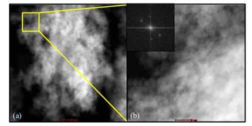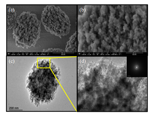 FE-SEM image (Fig. 4(a)) of HSZs-120 indicates that the sample consists of uniform shuttle-like 800-1000 nm particles with a rough surface. At higher magnification (Fig. 4(b)), mesopores over 10-80 nm are visible, which is consistent with the N2 adsorption-desorption results, and indicates abundant mesoporosity. Because of the density difference of the crystallized frameworks and the mesopore areas, in the TEM image of Fig. 4(c), the clear bright-to-dark contrast reflects the development of mesoporosity in the synthesized hierarchical zeolite crystals. The high-resolution TEM image and corresponding selected area electron diffraction (SAED) in Fig. 4(d) reveal parallel lattice fringes throughout the entire particle and periodic diffraction spots, which demonstrates the single crystalline nature of HSZs-120, and that the introduction of mesopores maintains the single crystal integrity. The creation of extensive mesoporosity could be more distinctly identified from HAADF-STEM (Fig. 5) projection, which demonstrates an even clearer contrast of mesopores on the selected smaller particle. The corresponding fast Fourier transformation also provides evidence as to its single crystal property.