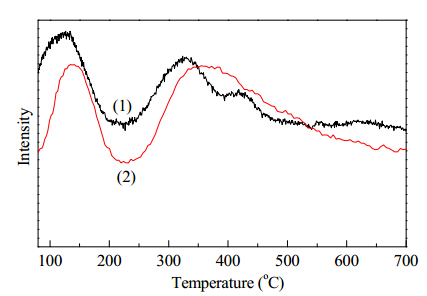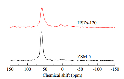 The aluminum content of HSZs-120 was determined by X-ray fluorescence (XRF). The Si/Al ratio is ~46.6 and is close to 50 in the initial gel composition. The 27Al magic-angle spinning nuclear magnetic resonance (MAS NMR) spectrum was investigated to characterize the Al coordination state in the synthesized HSZs-120. Fig. 6 confirms that the Al species are coordinated tetrahedrally into the zeolitic framework based on the strong signal at 60 ppm, whereas the negligible signal at 0 ppm suggests the absence of an octahedral extra-framework Al species [15]. NH3-TPD (Fig. 7) was conducted to compare the acidity of HSZs-120 with that of conventional ZSM-5. Both show similar profiles with desorption peaks at 140 and 330 °C that represent weak and strong acidity, respectively, which proves that the integration of mesopores into the crystalline framework has a negligible influence on material acidity.