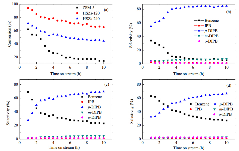 The cracking of TIPB was conducted to evaluate the catalytic activity of the prepared catalysts. In a typical experiment, the reaction was carried out in a continuous flow fixed-bed reactor under atmospheric pressure using N2 as the carrier gas at 30 ml/min and 500 °C for 10 h. Before the reaction, the catalysts were activated at 500 °C for 1.5 h in N2 (30 ml/min). The reactant was injected into the reaction system at 0.02 ml/min (space velocity 6.0 ml/(g·h)) using a plunger pump and vaporized at 300 °C before catalytic reaction. The resultant products were condensed by reflux condensation alcohol at 0 °C. The products were separated and analysed on a gas chromatograph (Shimadzu GC-2010 plus). The conversion and selectivity over the HSZs and a conventional ZSM-5 zeolite were compared to evaluate the activity and anti-deactivation properties of the corresponding catalysts.