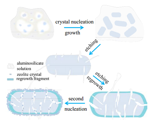 In the post-desilication preparation of hierarchical zeolites, Pérez-Ramírez’s group [30, 32] reported that TPA+ cations or aluminum complexes could act as mesopore growth moderators. The development of intracrystalline mesostructure depends on the balance between the affinity of structure- directing agent (TPA+ or aluminum complexes, which have a strong affinity to the zeolite surface and hinder the attack of OH-) to zeolite surface and dissolution of the crystal framework. Based on the characterization results, a “nucleation/growth- demetallation/recrystallization” mechanism is proposed here as illustrated in Scheme 1. During the initial hydrothermal synthesis stage, zeolite nucleation and growth are predominant and result from the highly concentrated precursor species and relevant concentration fluctuation [33], whereas the basic etching effect is insignificant because of protection by aluminum complexes and TPA+ cations that are incorporated in the micropores and dispersed in the reaction system. During the following hydrothermal treatment, basic etching becomes more dominant during the consumption of aluminum complexes and TPA+ cations, and consequently mesostructure emerge gradually in pre-formed zeolite particles and HSZs form. Zeolite nucleation/growth and demetallation by basic etching therefore takes place sequentially in a one-pot synthesis, and leads to the formation of HSZs particles. In the later stages of hydrothermal treatment, since the basic etching rate is approximately proportional to the surface area of the dissolving particles and the degree of undersaturation of the reaction solution [34], the pore volume and external surface area will increase rapidly during the creation of mesostructure on the particle surface, and is accompanied by the dissolution of abundant aluminosilicate species in the synthesis solution. Therefore, substantial secondary nucleation and/or re-assembly (or re-deposition) and regrowth occurs, and newly formed small zeolite particles will recrystallize and grow on the external surface of pre-formed HSZs [35].