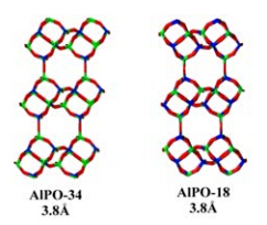 Since the discovery of microporous aluminophosphates and their heteroatom substituted variants[1, 2, 3], many studies have been undertaken in the synthesis, in situ and ex situ characterisation, and application, including shape-selective catalysis, of these materials[4, 5, 6, 7, 8, 9, 10, 11, 12, 13, 14]. Small-pore systems, such as AlPO4-18 (AEI) and AlPO4-34 (CHA), have attracted considerable attention because of their ability to perform highly regioselective oxidation of alkanes and selective conversion of methanol to light olefins [15]. Recently, these materials have been targeted for application as catalysts in environmental control technologies[16, 17]. One of the key factors in the preparation of such materials is the choice and concentration of organic bases that act as structure-directing agents (SDAs) during the synthesis. For the preparation of both AEI and CHA, the presence of a specific SDA facilitates the formation of a cage structure. The cage in both materials is the same, but differences in the stacking of these cages give rise to crystallographically distinct phases (Fig. 1).