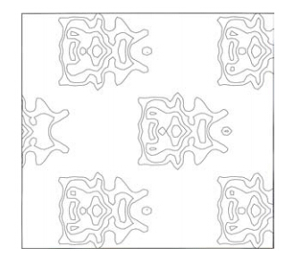The experimental and calculated XRD patterns obtained from the Rietveld analysis using only the framework structure are shown in Fig. 4. In this figure, the difference is significant at low 2q values because the structure of the template was not included at this stage. The inset shows the initial refinement for 30°-80°, in which the template has very little effect. It is clear that it is not possible to obtain the best likely fit without considering the template. The difference Fourier map generated from the initial refinement without including the template molecule is poorly defined (Fig. 5). However, it was possible to identify some atoms of the template molecule, and it was most likely that there was only one template molecule per cage. However, for better refinement, a reasonable structural model for the template must be postulated. Thus, computational modelling methods were used to identify the likely energetically favourable geometries of the template molecule within the pores. The MC docking technique was used [34], which has previously been shown to provide excellent agreement with experiment when considering template geometries [38].