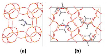 Firstly, the docking procedure was used to identify the lowest energy configuration of a single template molecule per cage at different loadings, and then when two template molecules are present in the cage (as was reported for triethylamine in AlPO4-34 by Lewis et al. [18]). Although the docking methodology is capable of generating the later structures, the small void space of the cage makes such an automated procedure difficult and time-consuming, and hence the templates were placed manually as well.
