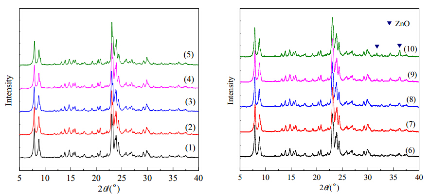 X-ray diffraction (XRD) patterns were recorded on a Rigaku MiniFlex II desktop X-ray diffractometer (λ = 154.06 pm, 30 kV, 15 mA) using Cu Kα radiation. The BET surface area was calculated from the N2 adsorption-desorption isotherm measured at -195.8 °C on a Micromeritics TriStar II. Prior to the measurement, the sample was outgassed at 300 °C for 8 h. The actual amounts of Si, Al and Zn in the sample were determined by ICP-AES (Autoscan16, TJA). The crystal morphology and size were obtained with a field emission scanning electron microscope (FESEM, JSM 7001-F, JEOL, Japan). The acidity was measured by the temperature programmed desorption of NH3 (NH3-TPD) with a Micromeritics AutoChem II 2920 chemisorption analyzer equipped with a thermal conductivity detector (TCD). Approximately 100 mg of zeolite sample was pretreated in Ar stream (30 ml/min) at 550 °C for 2 h and then cooled down to 120 °C. The adsorption of NH3 on the zeolite sample was achieved by introducing gaseous NH3 (5 vol% in Ar, 30 ml/min) into the sample tube for 30 min. The catalyst was flushed with Ar (30 ml/min) at 120 °C for 2 h to remove physisorbed NH3 from the catalyst surface. The TPD profile was recorded from 120 to 550 °C at a heating rate of 10 °C/min. The quantity of strong, medium and weak acid sites was measured by the amount of NH3 desorbed at 300-550, 200-300 and 100-200 °C, respectively. Fourier transform infrared (FT-IR ) spectra were measured on a Bruker Tensor 27 FT-IR spectrometer. The zeolite sample was first pressed into a self-supported wafer. Prior to the measurement, the sample cell was evacuated to 0.01 Pa at 450 °C for 2 h. The IR spectra were then recorded at room temperature. To get the FT-IR spectra for pyridine adsorption (Py-IR), pyridine vapor was introduced into the cell at room temperature for 1 h. The spectra were then recorded after evacuation at 150 °C for 1 h. The concentrations of the different acid sites were calculated by following the procedures reported by Madeira and coworkers [19]. X-ray photoelectron spectroscopy (XPS) was recorded on an AXIS ULTRA DLD spectrometer with an Al Kα radiation source (hν = 1486.6 eV). Zn 2p spectra were measured in the range of 1013-1063 eV.