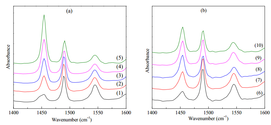 Chemisorbed pyridine on Brönsted acid sites and Lewis acid sites are characteristic by Py-IR absorption bands at 1545 and 1454 cm-1 (Fig. 3), respectively. The different distribution of the Lewis and Brönsted acid sites with the introduction of Zn by the different methods pointed to the generation of new Lewis acid sites with the consumption of Brönsted acid sites (Table 2). With the increase of Zn content in the samples obtained by the different methods, the amount of Brönsted acid sites decreased and the amount of Lewis acid sites increased. As a consequence, the decrease of the B/L ratio with the increase of Zn content confirmed that an interaction between the Brönsted acid sites and Zn ions occurred. On comparing the Zn-containing samples prepared by the different methods, it was found that a much higher B/L ratio was obtained on the Zn(PM)/HZSM-5 zeolite obtained from physically mixing.