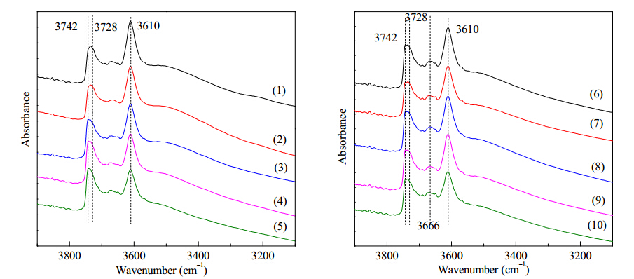 The FT-IR spectra in the OH stretching region (Fig. 4) suggested that HZSM-5 contained Brönsted acid groups (3610 cm-1) associated with the framework aluminum [Si(OH)Al], isolated external silanol groups (3742 cm-1), free internal silanol groups (3728 cm-1), and delocalized hydrogen-bonded groups (3500 cm-1) of lattice defects. On the samples Zn(IE)/HZSM-5 prepared by ion exchange, the introduction of Zn species has little effect on the OH groups associated with 3500 and 3742 cm-1, the silanol groups characteristic by 3728 cm-1 were decreased slightly, which was attributed to the interaction between the internal silanol groups and Zn(OH)+ cations located in cationic positions of the zeolites [21], and the Brönsted acid groups (3610 cm-1) were decreased obviously, suggesting the consumption of zeolite protons by ion exchange with Zn2+. However, on the Zn(PM)/HZSM-5 samples prepared by physically mixing, the interaction between the Zn species with the hydroxyl groups differed from that of Zn(IE)/HZSM-5. Although a similar interaction between zeolite protons or internal silanol groups with Zn species was also found to a much smaller extent, a more pronounced change centered at 3666 cm-1 was observed. This was the result of the formation of external Zn-OH groups on ZnO clusters [22]. This result confirmed that the ZnO species were mainly located on the surface of the zeolite for the Zn(PM)/HZSM-5 zeolites. Niu et al. [23] suggested that Zn-Lewis acid species Zn(OH)+ was dominant in the Zn (IE)/HZSM-5 zeolite, and ZnO species was the main species on Zn-containing samples prepared by the physically mixing method.