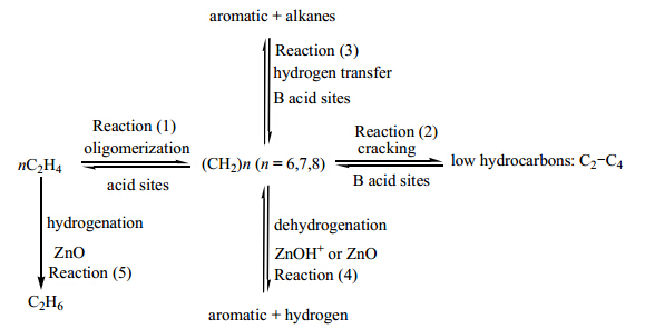 Aromatic hydrocarbons are the foundation of organic chemicals, and are widely used in the production of drugs, fuel, and polymers. Aromatic hydrocarbons are mainly obtained from oil and coal tar industrially by catalytic reforming and aromatic extraction processes. With the growing shortage of oil resources, researchers are developing new routes for aromatic production. The aromatization of the dry gas (methane, ethane, ethylene) from catalytic cracking and liquid petroleum gases (propane, propylene, and C4 hydrocarbons) have received wide attention [1, 2, 3, 4]. However, research on ethylene aromatization is limited [5, 6].