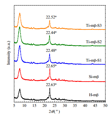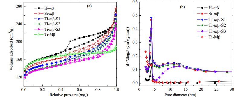 The textural properties of the synthesized materials were determined using N2 adsorption-desorption isotherm analysis. As shown in Fig. 4(a), all the samples showed type IV isotherms with an increase in the adsorbed amount at a relative pressure of 0.4-0.9; this implies the presence of mesopores in the synthesized materials. In the pore size distribution profiles shown in Fig. 4(b), a peak centered at 3.9 nm can be observed for all the synthesized hierarchical β zeolites. Table 1 summarizes the BET surface areas, pore volumes, and pore sizes (3.9 nm) of the synthesized materials. All the samples had similar textural properties; this is consistent with the XRD and SEM results, and further proves the effectiveness of this solid-state reaction. The small differences between the volumes and surface areas of H-mβ and Si-mβ can be explained by partial deformation of the zeolite frameworks as a result of dealumination under harsh conditions [19]. After the introduction of Ti atoms, these values increased slightly; similar observations have been reported for the post-synthesis of hierarchical Sn-β materials [20].