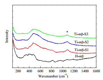 The UV-vis spectra of the synthesized Ti-mβ are presented in Fig. 5. All the samples show a distinct absorption peak near 220 nm, which is attributed to the ligand-to-metal charge-transfer of isolated [TiO4] or [HOTiO]; the band intensity increases with increasing Ti content. This is direct evidence of the successful incorporation of Ti atoms into the zeolite frameworks [21]. No significant absorption was observed above 330 nm in the spectra, which indicates that no bulky TiO2 or Ti-enriched species were formed in the samples [11]. This conclusion is confirmed by UV-Raman spectroscopy. As shown in Fig. 6, there are no distinguishable peaks near 140, 510, and 630 cm−1, which would provide direct evidence of anatase TiO2 [22]. Unlike that of H-mβ, the UV-Raman spectra of the synthesized Ti-mβ zeolites clearly show a new band at 1090 cm−1, which is attributed to framework tetrahedrally coordinated Ti species (Ti-O-Si), based on a previous literature report [23].
