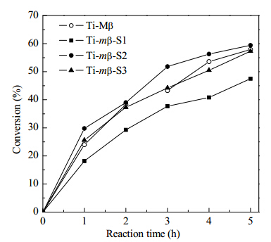 The catalytic properties of microporous Ti-Mβ and hierarchical Ti-mβ were investigated in the epoxidation of cyclohexene and 1-dodecene, which have different molecular sizes. As shown in Fig. 7 and Table 2, when cyclohexene was used as the reaction substrate, because of its small molecular size, which allows smooth diffusion in the microporous channels of both the microporous and hierarchical zeolites, microporous Ti-Mβ (Ti 2.61 wt%) and hierarchical Ti-mβ-S2 (Ti 2.91 wt%) give similar cyclohexene conversions (57.9% vs 59.4%) and cyclohexene oxide selectivities (25.4% vs 24.2%). This indicates that the synthesized hierarchical Ti-mβ zeolites have intrinsic activities similar to those of their microporous counterparts; this can be understood based on the structural characterization results. The Ti content in the synthesized Ti-mβ-Sx varies depending on the designed chemical composition. The substrate conversion increased from 47.5% of Ti-mβ-S1 (Ti 1.01 wt%) to 59.4% of Ti-mβ-S2 (Ti 2.91 wt%), with negligible differences in epoxide product selectivities among the Ti-mβ-Sx catalysts. However, although Ti-mβ-S3 has the highest Ti content, namely 4.29 wt%, 57.3% cyclohexene conversion was obtained, close to that of 59.4% for Ti-mβ-S2 (Ti 2.91 wt%). This may result from the limited amount of Ti doped in the zeolite frameworks [13]. In contrast, as shown in Table 2, if 1-dodecene is used in the epoxidation reaction, differences between the substrate conversions and epoxide selectivities of microporous Ti-Mβ and hierarchical Ti-mβ-S2 become apparent. Because of the large size of the 1-dodecene molecule, which significantly limits diffusion in the microporous channels, the conversion and epoxide selectivity of microporous Ti-Mβ are as low as 6.8% and 37.8%, respectively, whereas those of hierarchical Ti-mβ-S2 reach 11.1% and 60.3%, respectively. These results prove that the introduction of mesop orous structures into zeolites greatly improves the zeolite catalytic performance, especially for reactions involving bulky molecules.