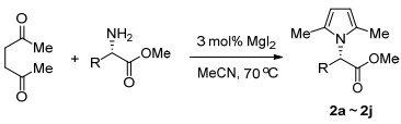 近年来报道了诸多Lewis酸, 如Ti(Oi-Pr)4[16], ZrO-Cl2·8H2O[17], Sc(OTf)3[18], Bi(NO3)3·5H2O[19], ZrCl4[20], BiCl3/SiO2[21], InCl3[22]和FeCl3[23]催化的伯胺和1, 4-二酮的Paal-Knorr环合反应, 但上述方法存在一定的局限性, 如反应条件苛刻、底物通适性不好以及容易在杂环母核上发生多种取代副反应.因此, 寻找一种反应条件温和、高效、高选择性的Paal-Knorr反应催化剂来合成N-取代吡咯衍生物变得尤为迫切. Lewis酸性镁催化剂已广泛应用于C—C键的形成以及官能团转化的有机化学反应中[24], 论文首次研究二碘化镁催化的手性氨基酸甲酯与2, 5-己二酮的Paal-Knorr缩合反应, 高产率、高立体选择性地合成了多种手性吡咯衍生物, 为制备新型结构手性吡咯衍生物提供了一条新途径(Eq. 1).