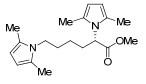 (S)-2, 6-二(2, 5-二甲基-1H-吡咯-1-基)己酸甲酯(2j):白色固体; ee > 99% [HPLC测定, 手性OD柱[V(正己烷):V(异丙醇)=90:10, 1.0 mL/min, λ=254 nm]; Rf=0.62 [V(石油醚):V(乙酸乙酯)=3:1]. m.p. 92.1~93.7 ℃; [α]D25-28.84 (c=0.5, CHCl3); lH NMR (500 MHz, CDCl3) δ: 1.34 (s, 1H), 1.49 (dd, J=5.3, 10.1 Hz, 1H), 1.73~1.80 (m, 1H), 2.34 (d, J=2.4 Hz, 12H), 2.40~2.45 (m, 1H), 3.81~23.86 (m, 2H), 4.80 (dd, J=5.6, 10.1 Hz, 1H), 5.91 (s, 2H), 5.96 (s, 2H); 13C NMR (125 MHz, CDCl3)δ: 12.2, 13.0, 23.5, 30.4, 30.7, 43.0, 52.2, 56.8, 104.9, 106.4, 126.8, 127.7, 171.0; FT-IR (KBr) v: 3105, 2954, 2933, 1742, 1519, 1435, 1401, 1234, 1122, 1060, 966, 759 cm-1; ESI-MS m/z: 317 [M+H]+; HRMS (ESI) calcd for C19H29N2O2 317.2151, found 317.2136.