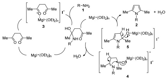 我们对MgI2催化的Paal-Knorr反应机理进行了初步的推测, 如Scheme 1所示.首先MgI2与2, 5-己二酮中的羰基氧原子进行配位, 羰基得到活化, 然后与伯胺进行亲核加成消除反应, 得到中间体4, 再次被MgI2活化以相同的方式发生分子内亲核加成反应生成过渡中间体5, 5发生芳构化得到吡咯衍生物2, 同时催化剂MgI2得到再生, 完成一个催化循环.