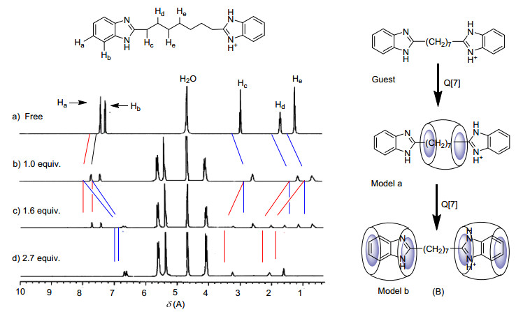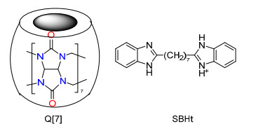 苯并咪唑及其衍生物广泛用于催化、药物、荧光探针、电致发光、磁性等方面, 其对金属离子具有优良的配位性能, 是一类优良的配体骨架[5], 因此开展关于苯并咪唑类化合物的合成及应用研究具有重要的理论参考价值及良好的应用前景.作者前期研究工作[6]发现, 烷基双苯并咪唑类化合物可作为一种潜在的类轮完轴承材料, 与Q[7]作用具有良好的光谱学信号响应.为了进一步探索较长烷基链双苯并咪唑类化合物与七元瓜环的相互作用规律及模式, 作者选取烷基链更长的氯化1, 7-二(2-苯并咪唑)庚烷(SBHt)作为客体, Q[7]作为主体, 主客体结构示意图如图 1所示, 利用1H NMR、紫外吸收光谱和荧光发射光谱等方法考察主客体之间的自组装模式并合成得到主客体自组装包结配合物, 单晶X射线衍射表征晶体结构, 为合成苯并咪唑类超分子物质提供理论参考以及其应用提供新的研究工作思路.