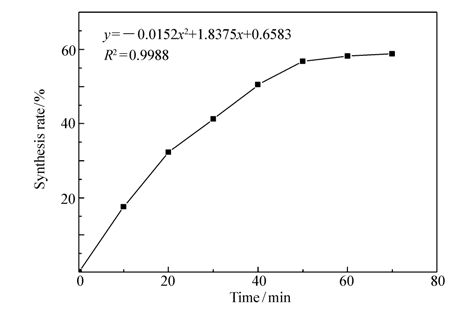 图 1为MTGase催化合成壳寡糖-水解麦醇溶肽的反应时间进程曲线。 从图 1可知,在50 min以内,共聚物的生成率随反应时间增加而上升,其线性方程为y=-0.0152x2+1.8375x+0.6583(R2=0.9988),超过50 min,共聚物的生成率不再随反应时间增加而上升。 可以解释为,MTGase催化合成壳寡糖-水解麦醇溶肽共聚物的反应过程由底物壳寡糖和水解麦醇溶肽扩散至酶的活性部位,并与酶形成中间复合物、发生酶促反应和产物壳寡糖-水解麦醇溶肽共聚物扩散离开酶3个阶段组成,因此,该共聚物的生成速率受到底物和产物扩散及MTGase活性控制。 在最初阶段,底物充足且MTGase处于活性最高水平,扩散至酶活性部位并与之形成中间复合物的底物不断增加,共聚物的生成速率不断上升;随着聚合反应的进行,因浓度减少导致的底物扩散势逐渐降低,分子增大造成的共聚物扩散速度减小[12]及蛋白质变性引发的酶活性不断下降,致使共聚物的生成速率不断降低并在50 min附近不再增加。 因此,适宜的合成时间为50 min。