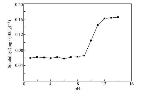 在pH值较低的溶剂中,H+的浓度比较高,导致壳寡糖-水解麦醇溶肽共聚物的解离度小,溶解度小;从pH=9开始,溶解度迅速增大,这个阶段影响溶解度的主要因素为酸碱度,较强的碱性溶液中含有大量OH-,OH-增大壳寡糖-水解麦醇溶肽共聚物的解离度,溶解度增大;而当pH=12以后,溶解度增加缓慢,这个阶段影响溶解度的主要因素是壳寡糖-水解麦醇溶肽共聚物的相对分子质量,由于相对分子质量太大,且分子上的疏水基团多,因此溶解度在pH=12以后增加缓慢。