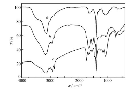 图 3谱线c为壳寡糖-水解麦醇溶肽共聚物的红外光谱。 从图中可以看出,该共聚物除了有壳寡糖的红外吸收外,还分别出现ν CH(3015 cm-1)、νs C—H(—CH2—)(2959 cm-1)、ν —CO—(—COOH)(1743 cm-1)和νCC(1456 cm-1)是蛋白的吸收峰。 由此可以推断,该共聚物中既存在着壳寡糖,又存在醇溶蛋白组分。由酰胺键吸收波数显著增加,确定合成了共聚物。