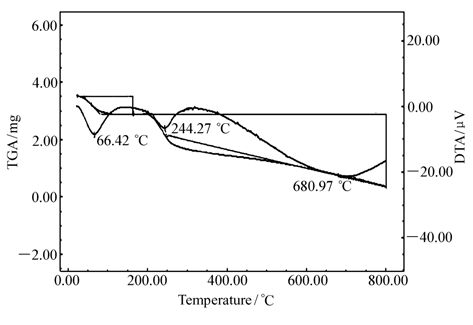 图 4为壳寡糖的TGA曲线。 由图 4可知,壳寡糖在66.42 ℃处失水吸热,失重约17.936%;212.89 ℃处开始熔融,244.27 ℃处壳寡糖主链开始断裂,最后在680.37 ℃彻底分解,失重72.143%。