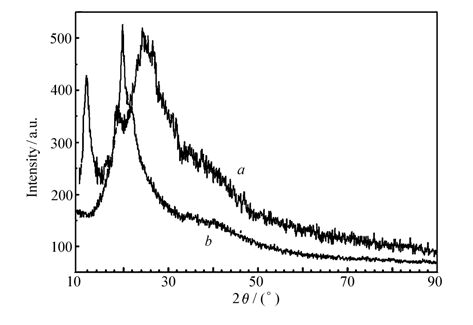 图 7谱图a为壳寡聚糖的XRD图,谱图b为壳寡糖-水解麦醇溶肽共聚物的XRD图。 由图 7可知,壳寡糖-水解麦醇溶肽共聚物在2θ=20°左右有强吸收峰,而壳寡聚糖在2θ=11°和25°左右有强吸收峰。 即证明壳寡糖-水解麦醇溶肽共聚物是不同于壳寡糖的一种物质。