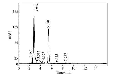 图 8为壳寡糖-水解麦醇溶肽共聚物高效液相色谱。 由图 8可以看出,图中有7个峰,主要的成分为第2和第5号峰(按出峰先后顺序),从峰面积可计算出,第2号峰面积占53.4%,第5号峰面积占27.2%,总和80.6%。