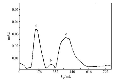 图 9为壳寡糖-水解麦醇溶肽共聚物凝胶过滤色谱图,与高效液相色谱图一样,凝胶过滤色谱图也反映出壳寡糖-水解麦醇溶肽共聚物有两种主要的成分。 然而毕竟凝胶过滤色谱没有高效液相色谱精确,全图中只有3个峰,高效液相色谱有7个峰。 接枝到壳寡糖上的麦醇溶蛋白多肽的数量有多有少,相对分子质量有大有小,而且有的分子是网状结构,所以壳寡糖-水解麦醇溶肽共聚物的相对分子质量分布很宽。从图 9可看出,一共3个峰,峰a的洗脱体积为144 mL;峰b的洗脱体积为306 mL;峰c的洗脱体积为468 mL。 根据文献[16]中介绍的方法,得公式Ve=-913lg Mw+4518,可计算出各自的相对分子质量分别为M1=66069、M2=41054、M3=27285。