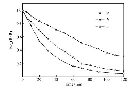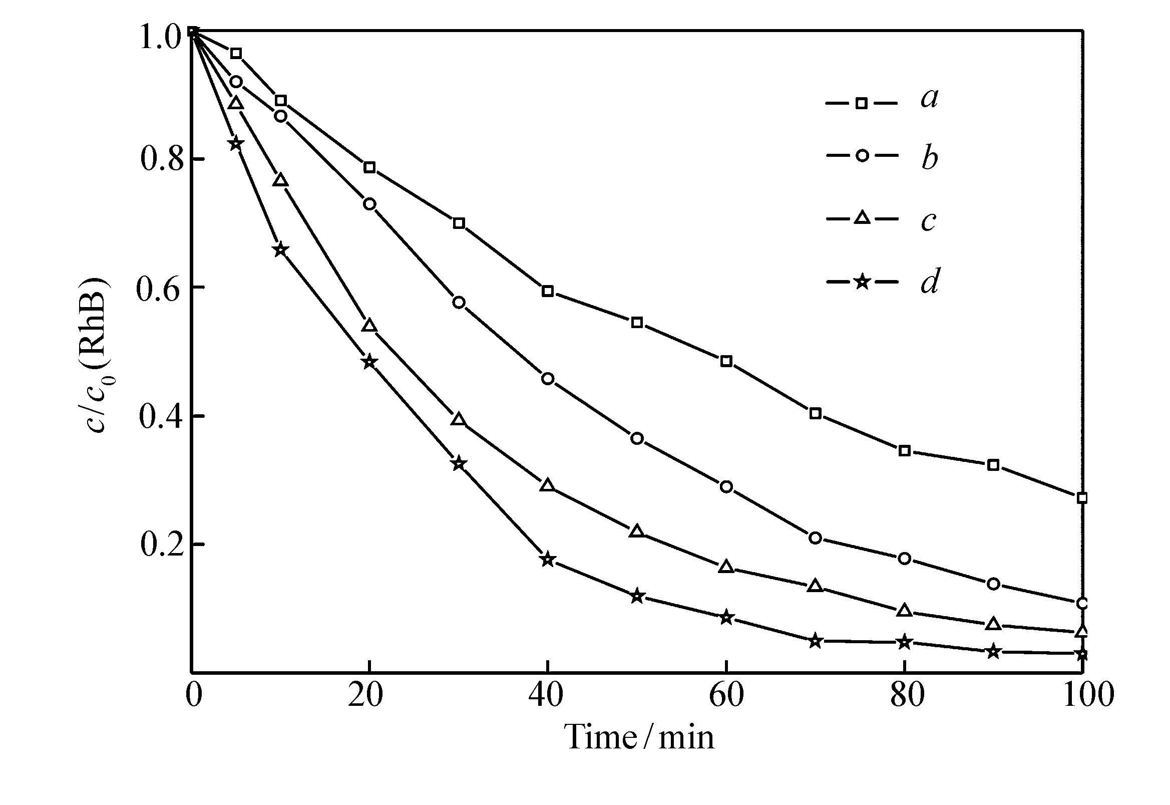 图 9为经不同温度焙烧得到的PW11Cr/TiO2纳米膜对RhB可见光催化降解的动力学曲线。由图 9可见,随着焙烧温度的提高,膜的光催化活性逐渐降低。这是因为温度的提高导致光催化活性中心Cr═OH2逐渐失去其配位水,这一点在上述红外光谱部分已得到证实。按照上述光催化反应机理,配位水的缺失破坏了-Cr═OH2光催化活性中心,因而PW11Cr/TiO2的光催化活性降低。