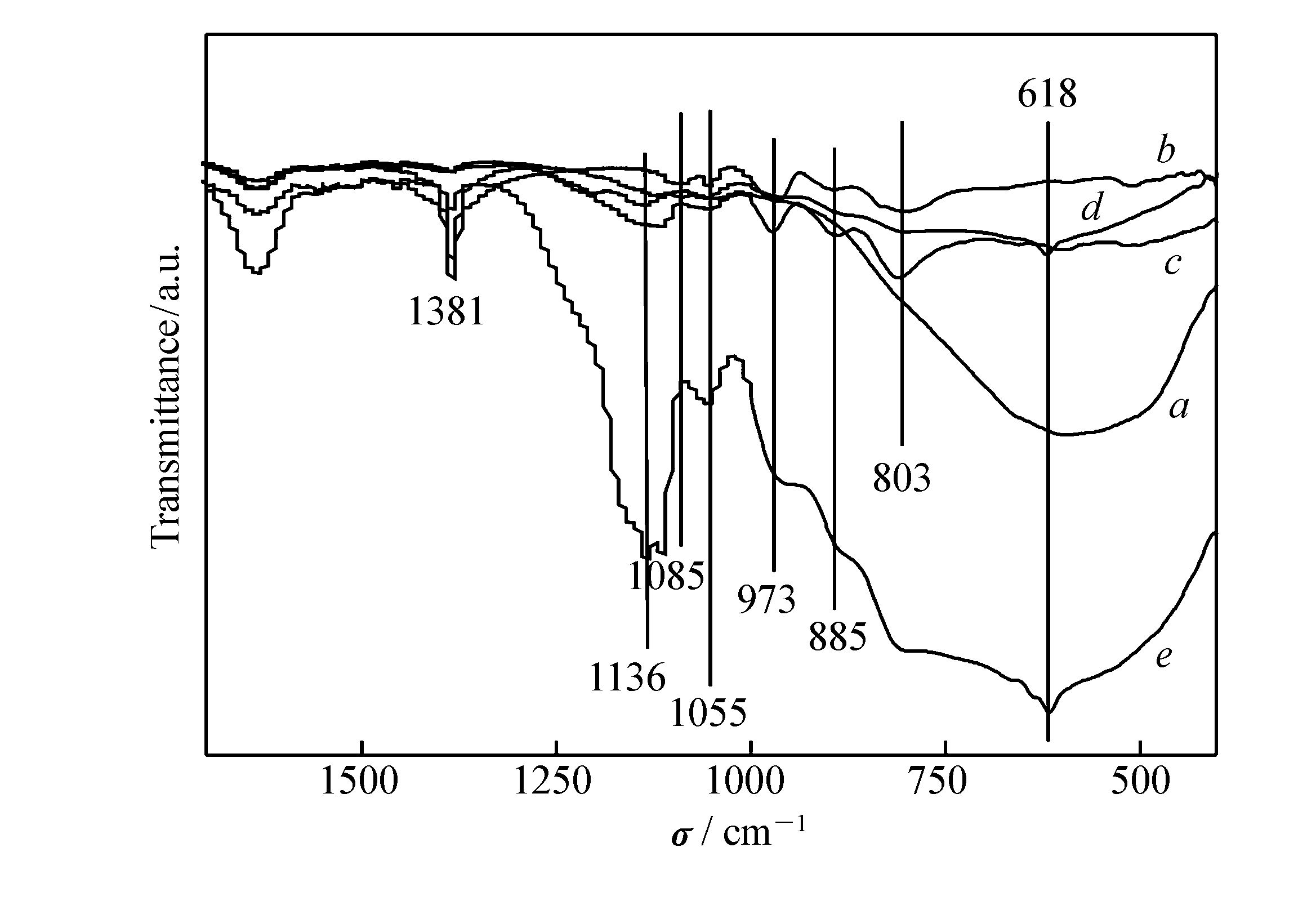 对不同焙烧温度下制备的PW11Cr/TiO2样品进行红外光谱(IR)表征,结果如图 2所示。由图 2可见,PW11Cr/TiO2有4个振动吸收峰,分别位于1055、973、885和803 cm-1处,与Keggin结构杂多化合物(PW12)在指纹区 (700~1100 cm-1)的4个特征吸收峰一致,分别对应于P—Oa、W═Od、W—Ob—W、W—Oc—W 4个键的反对称伸缩振动吸收[33]。对于PW11Cr,其P—a键的振动吸收有一个分裂峰,位于1085 cm-1处,这是PW12的一个W(VI)被Cr(Ⅲ)取代后分子对称性降低导致的结果。然而,随着焙烧温度的提高,在~1136 cm-1处出现了一个新峰,并随着焙烧温度的提高而加强,表明PW11Cr与TiO2发生了相互作用。此外,在1381 cm-1处,可以观察到与Cr(Ⅲ)配位的H2O分子的振动吸收峰,该峰随着焙烧温度的升高逐渐降低直至消失,表明配位水的失去。