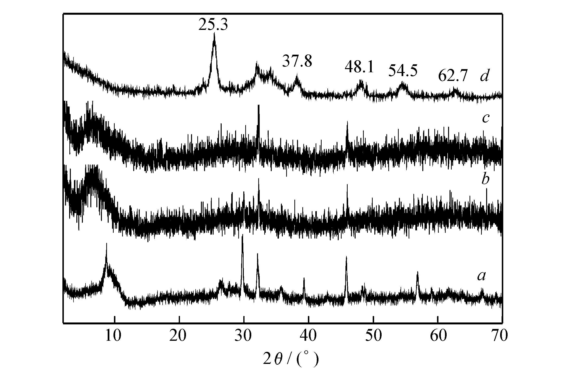 为了观察PW11Cr/TiO2光催化剂的晶相及其随焙烧温度的变化,测定了样品的XRD谱,结果如图 3所示。在500 ℃以下,TiO2的晶体衍射峰并不明显,但可以观察到PW11Cr的一些衍射峰,表明TiO2主要以无定形的形态存在[34],而PW11Cr则以独立的晶相分布在无定形的TiO2表面。经500 ℃焙烧后,PW11Cr/TiO2样品在25.3°、37.8°、48.1°、54.5°和62.7°处出现了明显的衍射峰,与四方晶系锐钛矿TiO2一致[12, 34],表明样品中的TiO2已由无定形态转化为锐钛矿晶相,而此时样品中PW11Cr的衍射峰已基本消失,因此,PW11Cr不再以独立的晶相分布在TiO2表面,而是分散在TiO2晶相中。