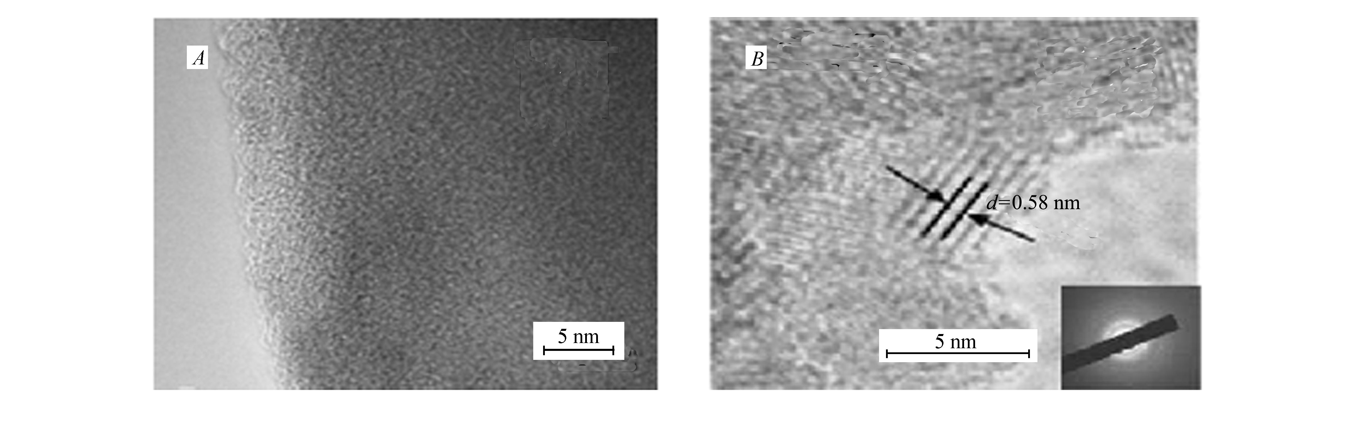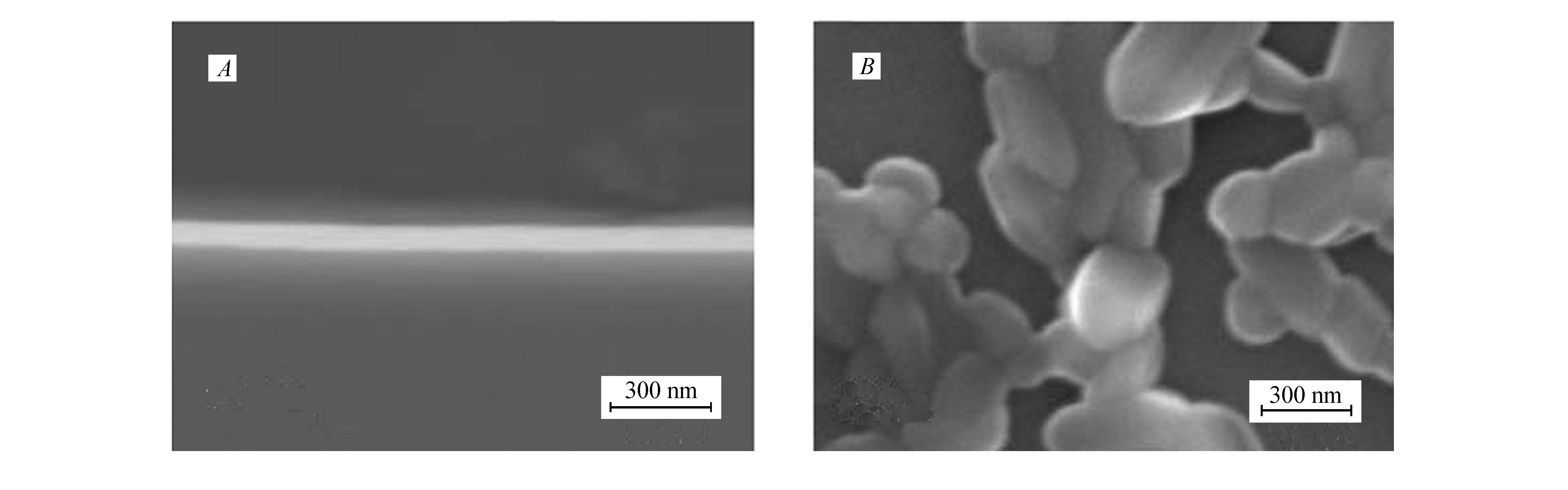 SEM和TEM揭示了PW11Cr/TiO2膜的表面结构形貌。在100 ℃下焙烧的PW11Cr/TiO2膜,表面呈均匀致密的非晶态结构(图 4A,图 5A,),与XRD表征的无定形态一致(图 3)。提高焙烧温度至500 ℃,表面膜转化为晶态结构,可以观察到 “米粒”状的晶粒分布在玻璃基体表面,晶粒的大小为100~600 nm(图 4B)。而且在TEM照片上可以清楚地观察到TiO2晶体的晶面(图 5B),例如面间距为0.58 nm的(101)面。从电子衍射实验得到的圆形衍射条纹表明(图 5B插图),TiO2为多晶结构。因此,PW11Cr/TiO2膜的表面结构形态与焙烧温度密切相关,低温(100 ℃)焙烧,膜呈无定形态;随着焙烧温度的提高,膜从无定形态向结晶态转化[10];高温焙烧(500 ℃)的膜呈结晶态,由PW11Cr/TiO2纳米粒子组成。