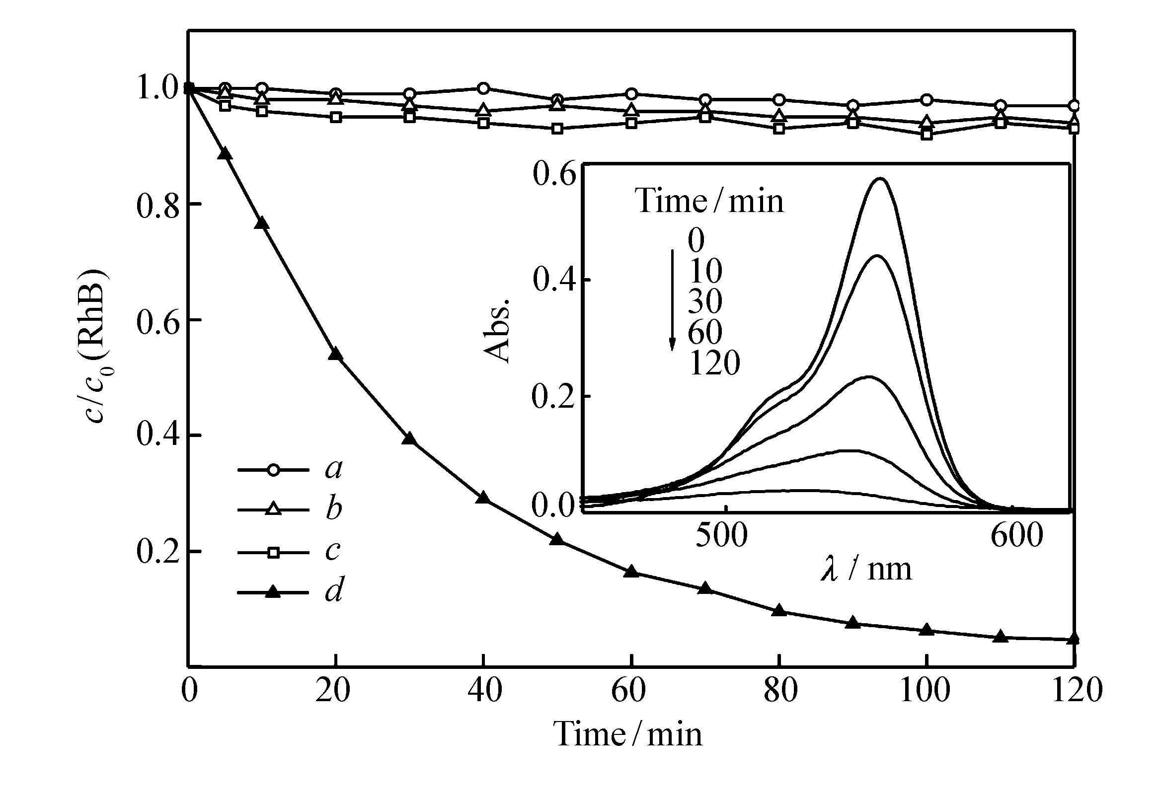 由图 6可见,在PW11Cr/TiO2纳米膜存在下,RhB可见光降解的速率大大增加(曲线d),光照120 min,RhB的降解率达95%。相比之下,当体系中不存在PW11Cr/TiO2纳米膜时,RhB几乎不发生可见光降解(曲线a)。将反应液置于暗处,即没有光参与作用,PW11Cr/TiO2纳米膜并不能导致RhB的降解(曲线b)。因此,可见光和PW11Cr/TiO2纳米膜的共同作用是RhB降解的原因和必要条件。为了区分可见光催化活性组分,在相同实验条件下做了纯TiO2纳米膜的对比实验,结果表明,在可见光照射下,纯TiO2纳米膜并不能引起RhB的降解(曲线c),因为TiO2对可见光没有吸收。因此,在PW11Cr/TiO2纳米膜中,可见光催化活性组分是PW11Cr,与我们的预计一致。