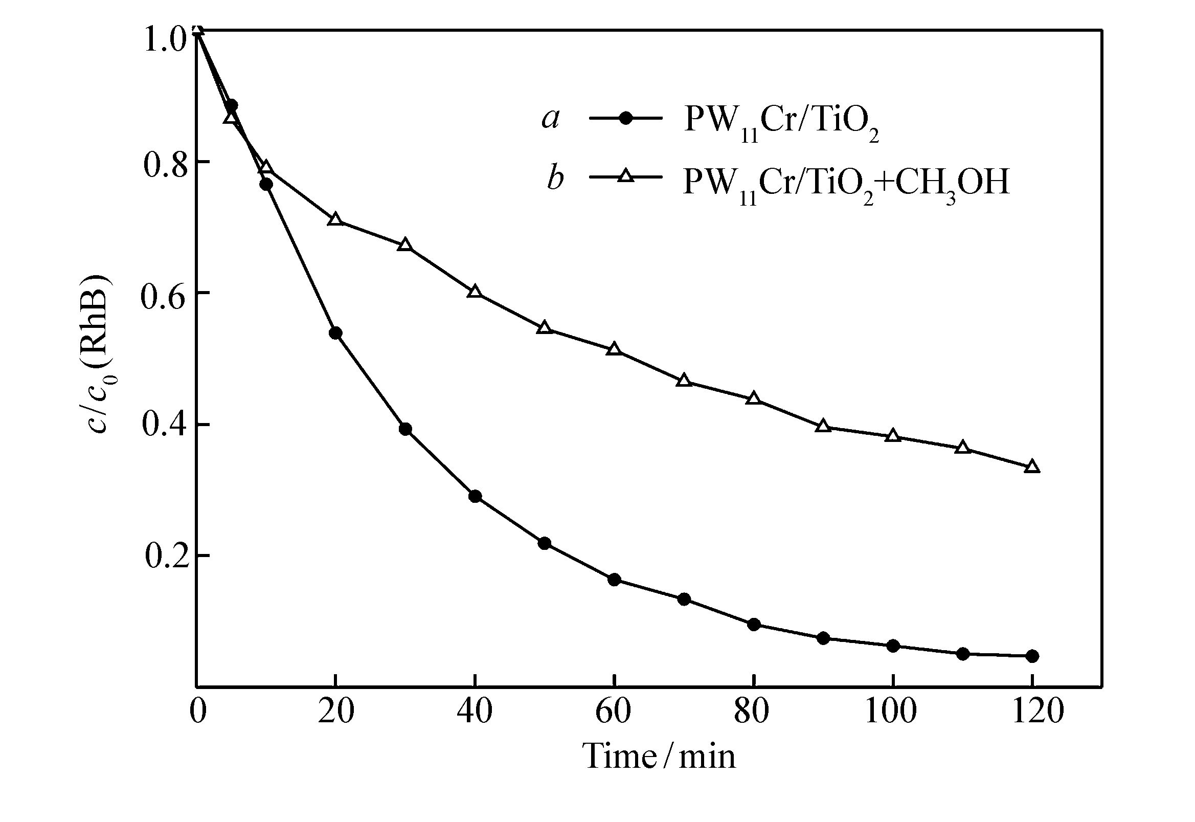 弄清楚引起RhB降解的反应氧活性物质有助于理解PW11Cr/TiO2纳米膜的光催化作用机理。赵进才及其合作者[30]曾用未取代的杂多阴离子PW12O403-(PW12)吸附在阴离子交换树脂D201表面制备了PW12/D201光催化剂,并研究了PW12/D201在H2O2存在下对RhB的可见光催化降解作用。电子顺磁共振实验表明,导致RhB脱乙酰基的是过氧氢自由基(HO2·),而使RhB开环降解的是H2O2和PW12结合产生的过氧物种。在本研究中,导致RhB降解的反应氧活性物质主要是羟基自由基,因为羟基自由基淬灭实验证明了这一点。从图 7可以看出,当反应进行至10 min时,向PW11Cr/TiO2反应体系中加入羟基自由基淬灭剂甲醇,RhB的降解速率明显降低,与PW11Cr均相体系类似[18]。