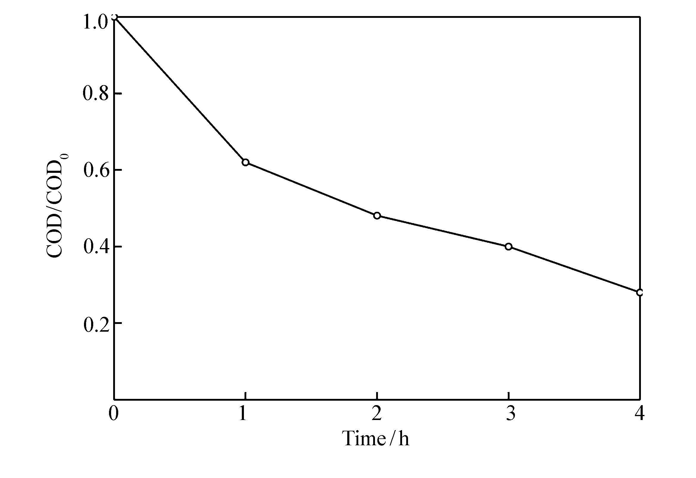 溶液COD值的测定:取5 mL反应液稀释至100 mL,然后于250 mL锥形瓶中加入5 mL H2SO4(1∶3)和10 mL 0.02 mol/L KMnO4(V1),加热至沸。沸腾30 min后加入0.005 mol/L Na2C2O4标准溶液10 mL,趁热用KMnO4溶液滴定至浅红色,记录回滴的体积(V2)。另按类似步骤测定KMnO4溶液相当于Na2C2O4标准溶液的体积比K和无离子水的空白值(V3),按下式计算化学耗氧量: