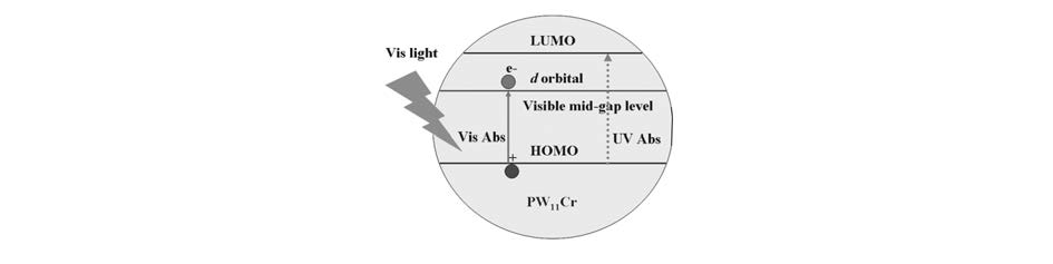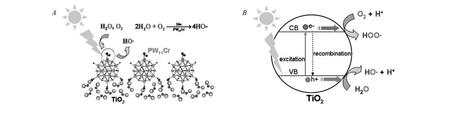 根据上述实验结果,PW11Cr/TiO2的可见光活性组分是PW11Cr,当可见光照射时,PW11Cr/TiO2中的PW11Cr接受光子被激发,光电子从最高占有分子轨道HOMO(Od)跃迁到Cr的d轨道(Scheme 1),发生Od(H2O)→Cr电荷转移,导致与Cr中心配位的H2O分子氧化,产生羟基自由基HO·和激发态的PW11Cr(H2O)*,后者被溶液中溶解的分子氧O2及后续产生的HOO·和H2O2氧化,恢复为PW11Cr(H2O),从而构成光催化循环。因此,在光的照射下,体系中只要存在H2O和O2,PW11Cr/TiO2就能将光能源源不断地转换为HO·形式的化学能(Scheme 2A)。由于HO·的氧化性很强,且反应没有选择性,可轻而易举地将水体中的有机物降解为小分子,乃至矿化为CO2和H2O。显然,PW11Cr/TiO2的光催化反应机理与传统半导体光催化剂如TiO2的反应机理明显不同。TiO2半导体受光激发时初级产生的是空穴-电子对,空穴和电子分离后分别迁移向半导体催化剂表面,在那里电子还原溶液中溶解的分子氧O2产生过氧负离子自由基O2-·或过氧氢自由基HOO·,空穴氧化H2O分子产生羟基自由基HO·和H+(Scheme 2B)。光电子初级给体是TiO2,初级受体是分子氧O2,光电子以“外球层”的方式进行转移,即光电子的转移发生在分子之间。如果光电子不能及时被分子氧O2接受,则光电子和空穴复合的几率很大,导致光催化反应量子效率降低。而PW11Cr/TiO2受光激发时,光电子初级给体是与Cr中心配位的H2O分子,初级受体是Cr中心,不存在空穴-电子对复合问题。光电子以“内球层”的方式进行转移,即光电子的转移发生在分子(离子)内部,因此,H2O分子在启动光催化反应中扮演着重要角色,H2O和Cr一起构成光催化反应的活性中心。