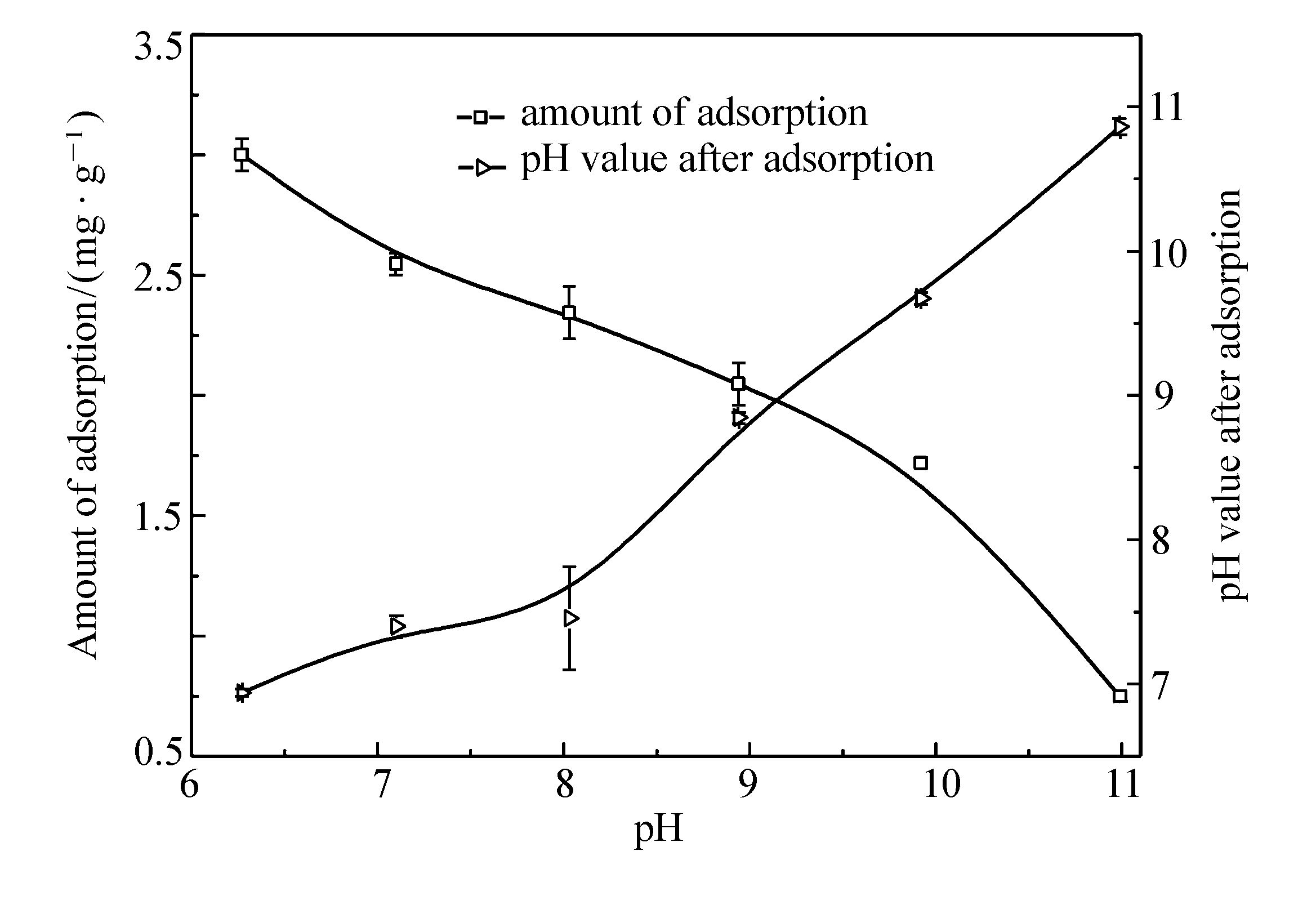 pH值会影响焦磷酸根的分解,但在弱酸性及碱性的条件下可以忽略分解对实验的影响[21-22],因此,本实验着重考察了初始pH值在6.27以上针铁矿对焦磷酸根的影响。由图 1可以看出,随着pH值的升高,针铁矿对焦磷酸根的吸附量逐渐降低。当pH值在6.27~9.92之间时,吸附量降低的比较缓慢;而当pH值达到10.99时,吸附量大幅降低了75%。图 1中同时给出了吸附后溶液的pH值,可以看出吸附后的pH值相对于初始pH值有所下降。