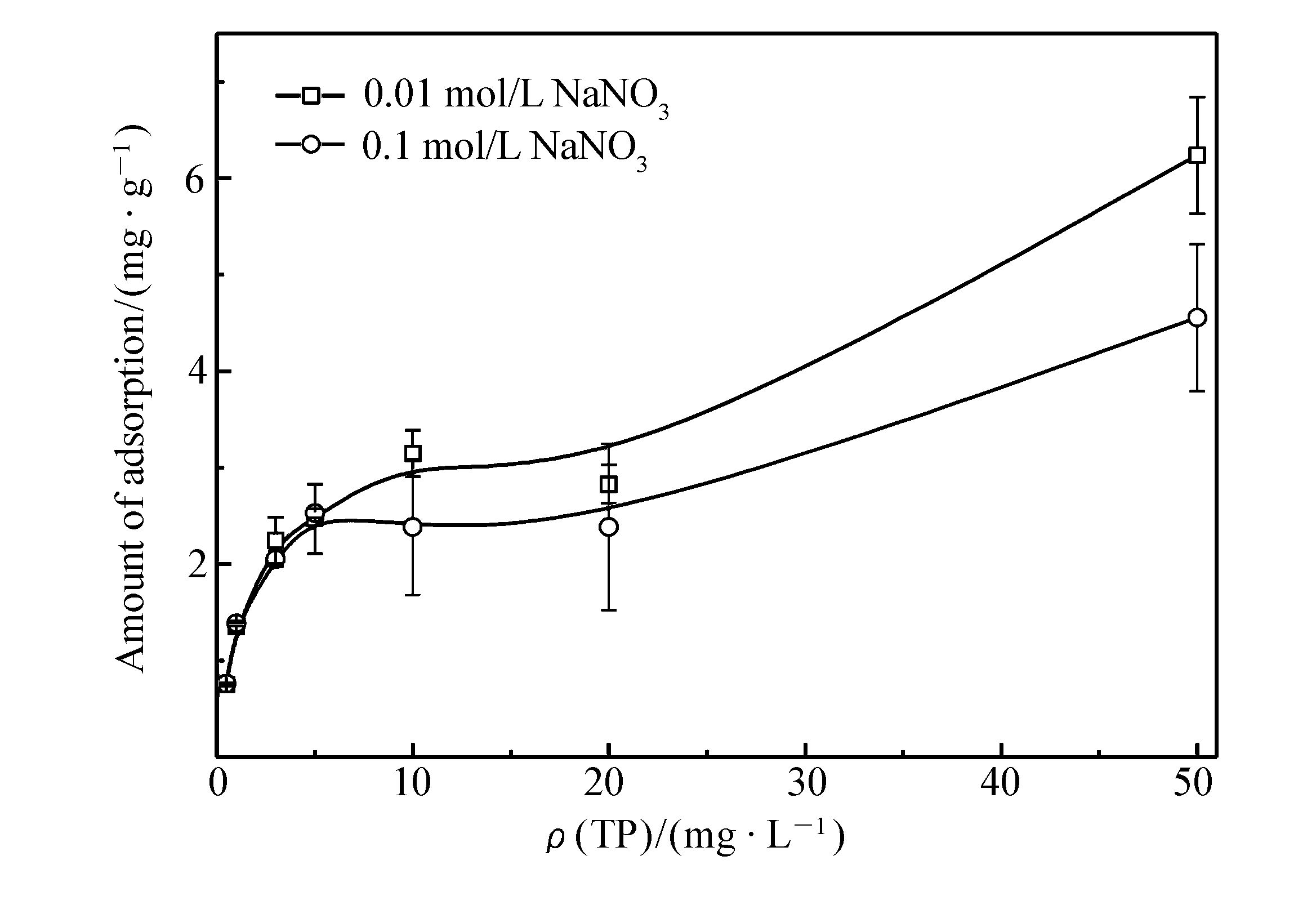 分别称取50 mg的针铁矿到数个离心管中,加入总磷质量浓度分别为0.5、1、3、5、10、20和50 mg/L的焦磷酸钠溶液50 mL,添加NaNO3使背景溶液浓度分别为0.1和0.01 mol/L两种离子强度,震荡吸附24 h,用0.45 μm的滤膜过滤后消解并测定过滤液中总磷含量,用差减法计算相应的吸附量。