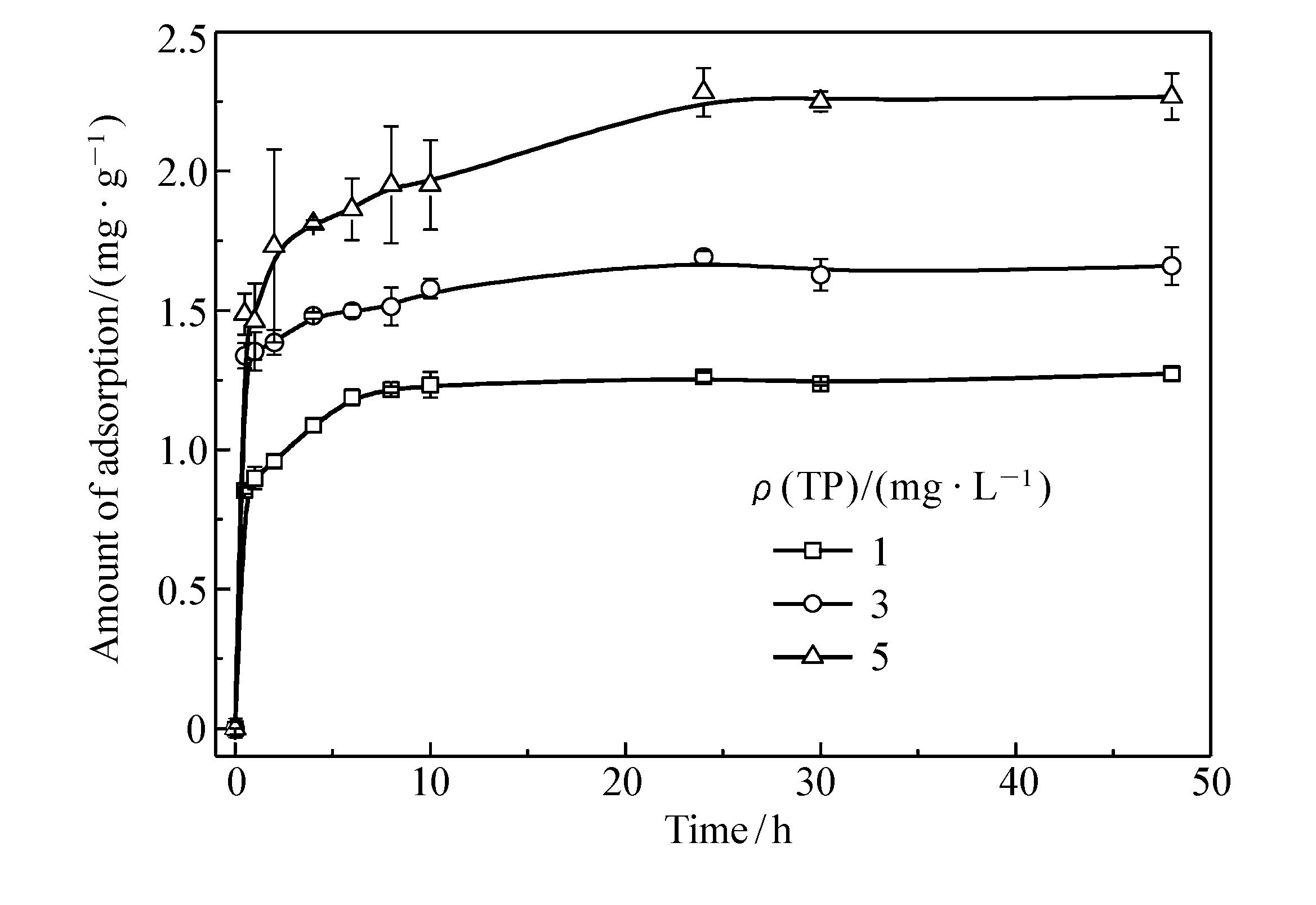 分别称取50 mg的针铁矿到数个离心管中,分别加入离子强度为0.01 mol/L NaNO3,总磷质量浓度为1、3、5 mg/L的焦磷酸钠溶液50 mL,在震荡的情况下分别在30 min、1 h、2 h、4 h、6 h、8 h、10 h、22 h、34 h和48 h取样过滤,步骤同上,测其吸光度并计算针铁矿的吸附容量。