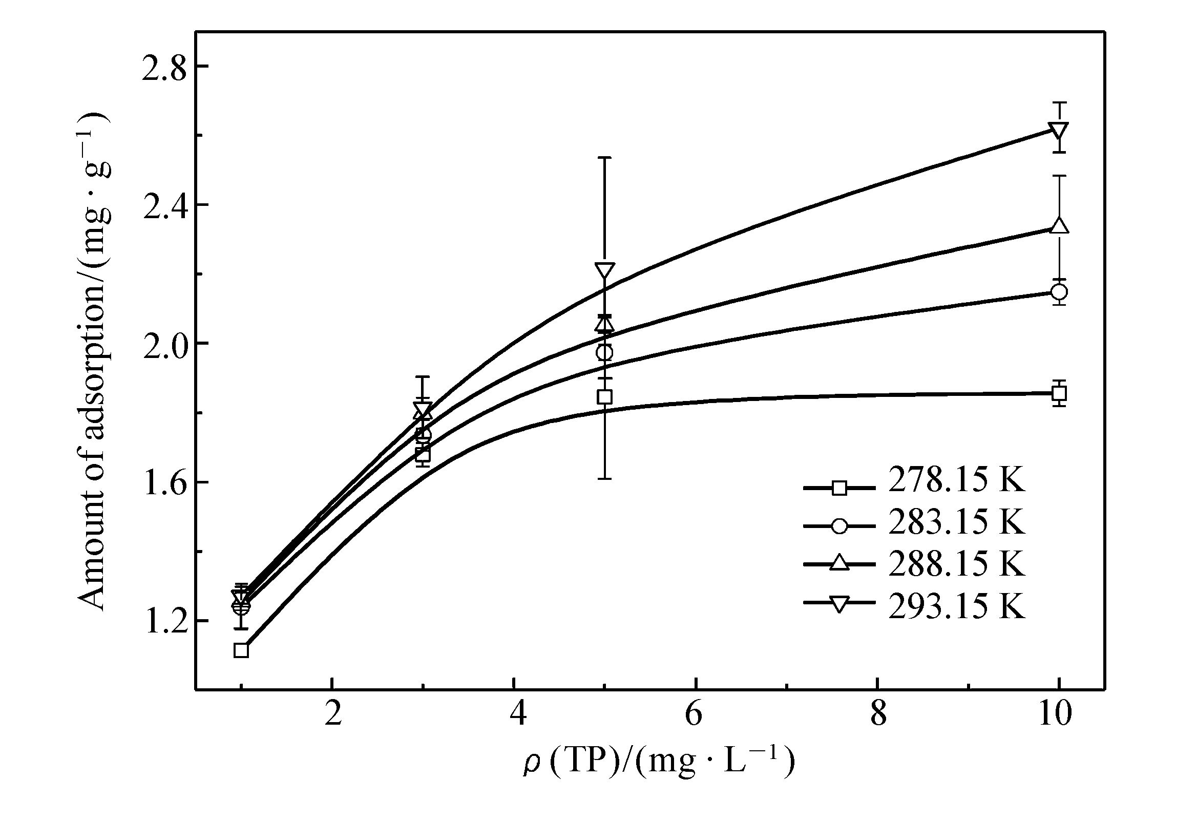 配制总磷初始质量浓度分别为1、3、5、10 mg/L的焦磷酸钠溶液,量取50 mL于离心管中,并分别加入50 mg的针铁矿吸附剂,置放在278.15、283.15、288.15和293.15 K的环境下24 h,取样过滤,测其吸光度并计算吸附量。