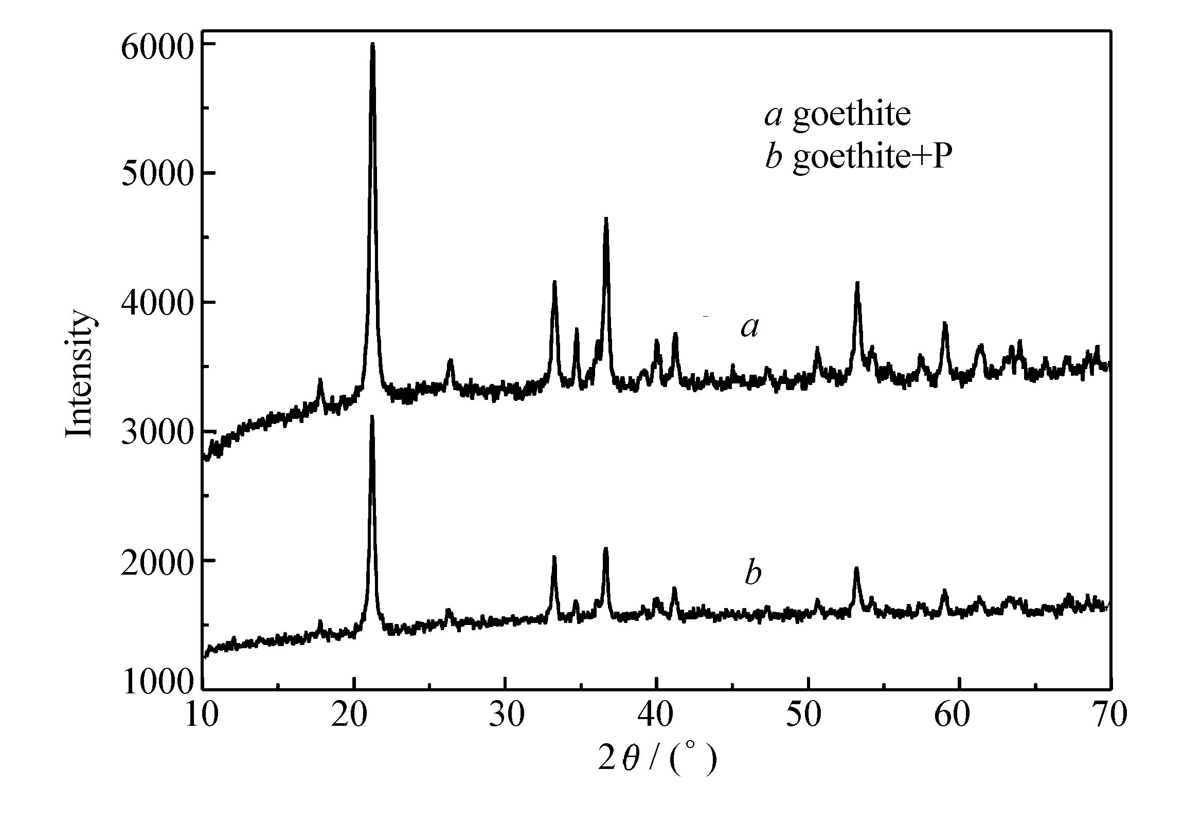 针铁矿吸附前后的X射线衍射(XRD)对比图谱如图 5所示。吸附前的针铁矿和针铁矿标准卡片(JCPS 卡片 29-0713)较为匹配,峰的位置基本一样,峰的强度相似,说明合成针铁矿结晶良好,并测得针铁矿的比表面积为28.62 m2/g。进一步对比可以看出,吸附焦磷酸根前后的针铁矿峰位基本一致,说明吸附过程中针铁矿并没有转变成新的物质。但是吸附后的针铁矿峰强普遍减弱,这可能是吸附过程中针铁矿的表面有一定的改变,从而影响了样品中针铁矿的物质纯度。