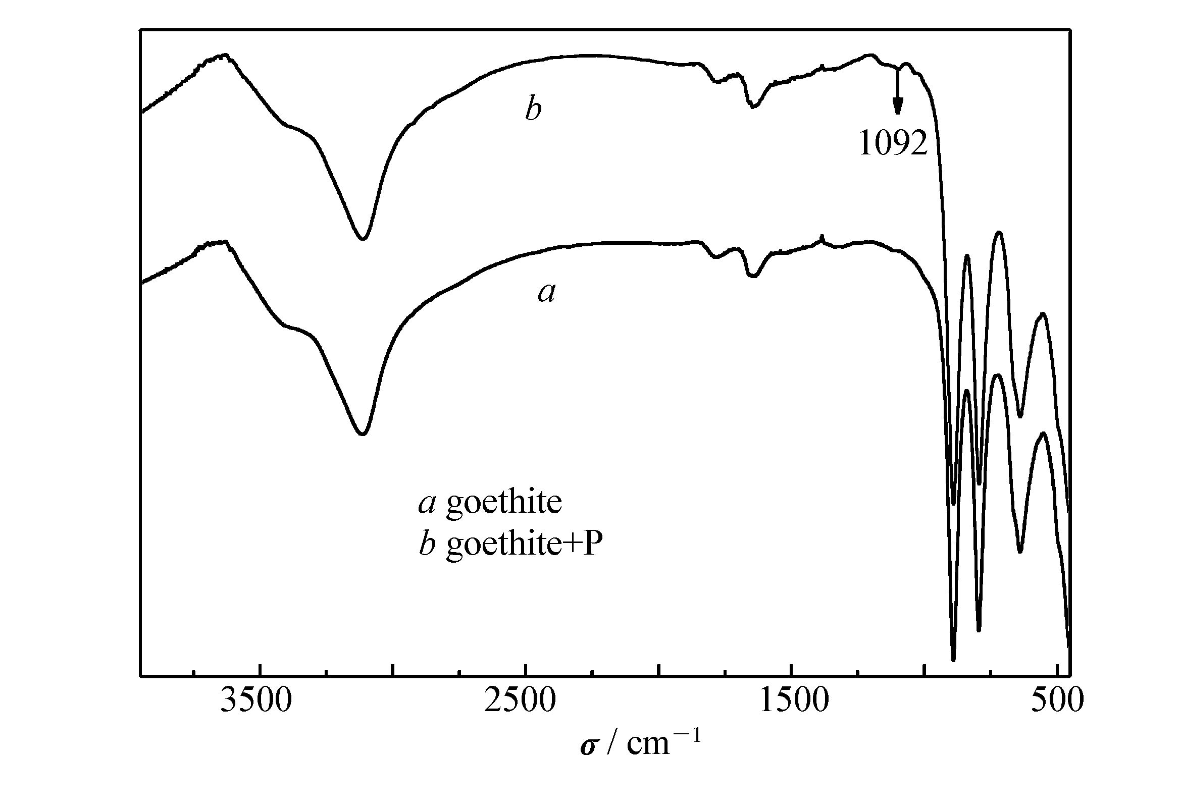 对未吸附焦磷酸根和吸附焦磷酸根后的针铁矿进行了红外光谱分析(FT-IR),分析结果如图 6所示,合成针铁矿的红外谱图与前人报道一致[20]。吸附前后的针铁矿在3100 cm-1波段附近都有强度很大的宽峰,这是针铁矿游离羟基(—OH)和水合基的吸收峰。比较吸附前后的红外谱图,吸附后的针铁矿在1092 cm-1处出现了明显的吸收峰,这属于P—O的伸缩振动峰[29],表明了针铁矿吸附焦磷酸根后表面基团的变化。