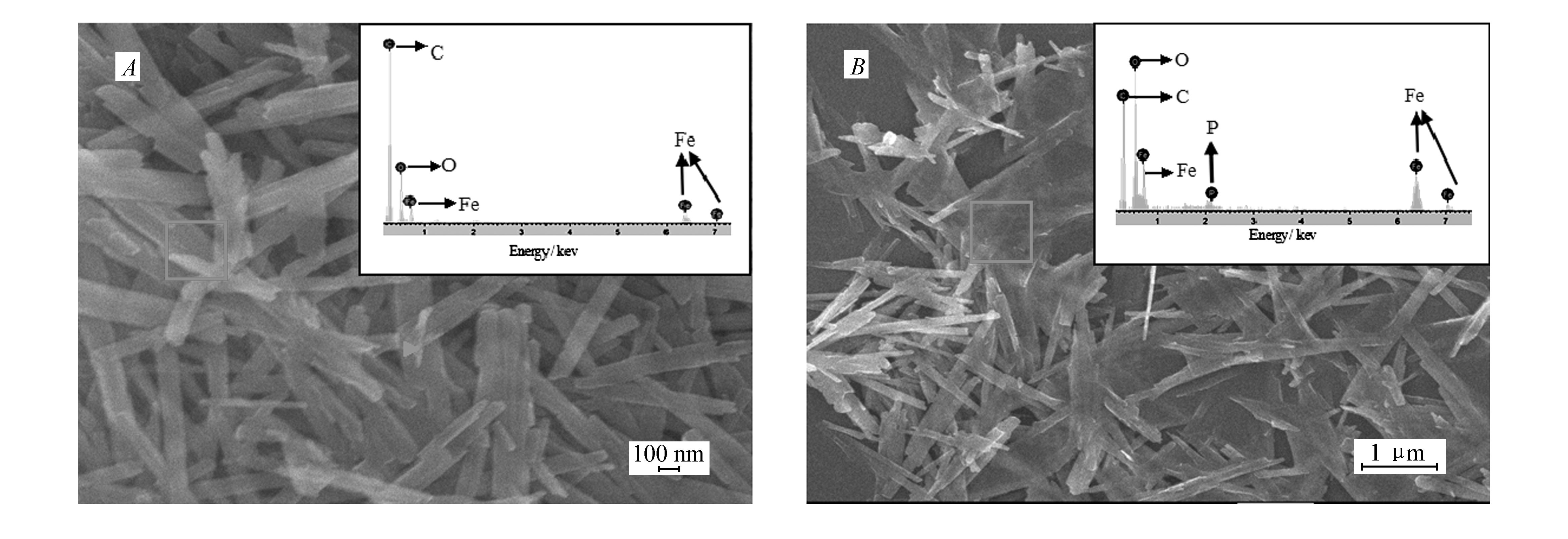 图 7为针铁矿吸附焦磷酸根前后的扫描电子显微镜(SEM)和X射线能谱(EDS)图像。从SEM照片中可以看出,吸附前针铁矿主要呈针状晶体分布,单分散不团聚,表面光滑没缺陷,结晶度很高;吸附后针铁矿表面覆盖了一层物质。对比吸附前后针铁矿样品微区的EDS能谱可以看出,吸附后针铁矿表面出现了P的能谱峰。表明吸附过程中针铁矿的表面发生了明显变化,结合吸附动力学分析以及XRD和红外光谱分析可推测,针铁矿对焦磷酸根的吸附可能是焦磷酸根在针铁矿表面发生了络合反应与物理吸附协同作用的结果。