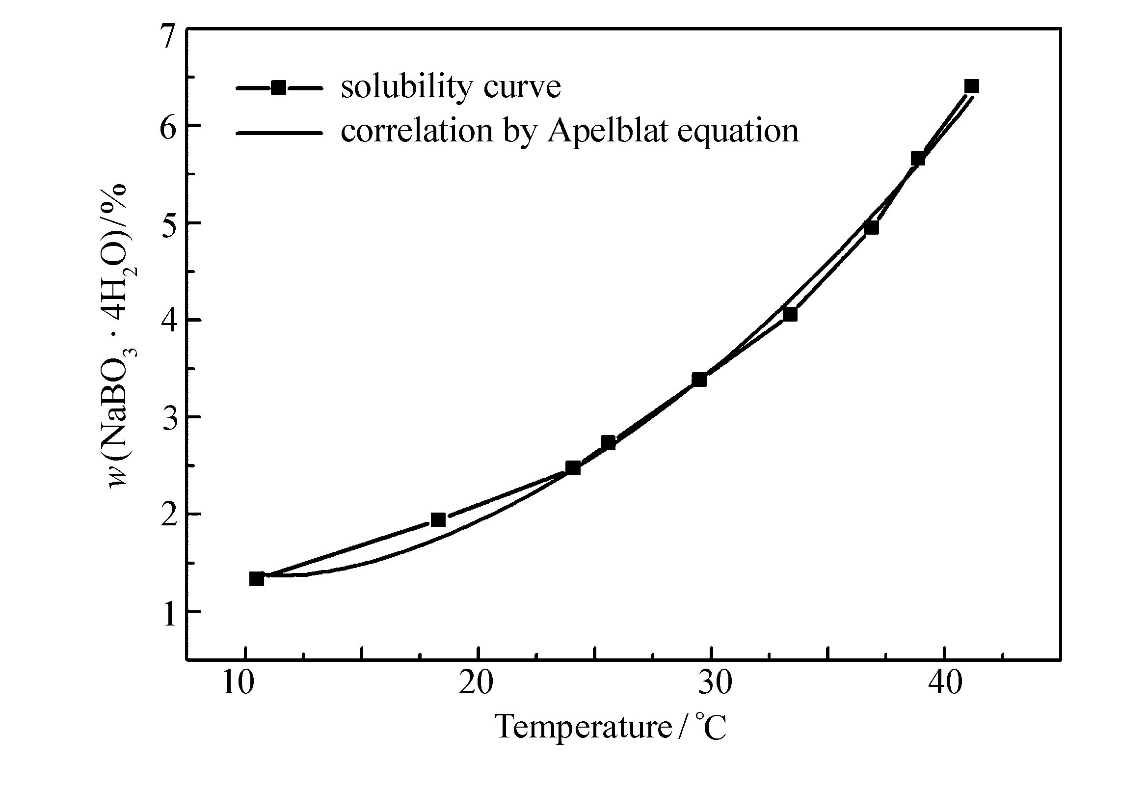 方程(4)即为Apelblat和Manzurola最先提出的Apelblat方程[7],该方程对溶解度关联较好,为较多研究者运用[8-9]。由Apelblat方程关联得到的过硼酸钠溶解度回归方程如下: