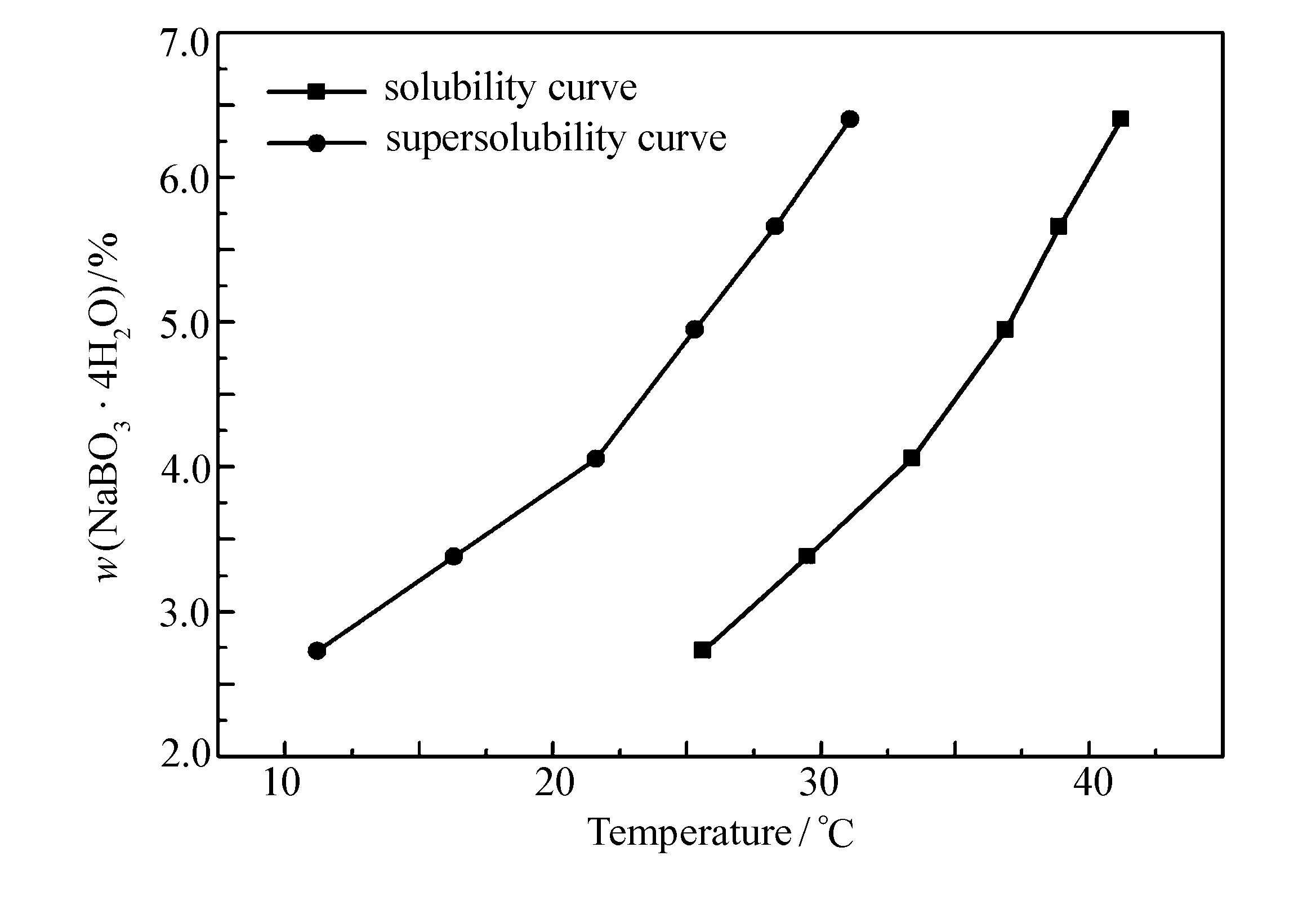 图 3为搅拌速率为200 r/min,降温速率为6 ℃/h时,过硼酸钠在纯水溶液中的介稳区。图中两条曲线之间的区域为过硼酸钠的结晶介稳区,由图 3可知,过硼酸钠在低温区介稳区的宽度在14.4 ℃左右,高温区的介稳区宽度在10.1 ℃左右,即高温下介稳区宽度比低温区较窄,这是由于温度升高,溶液黏度下降,溶质的扩散系数增加,分子的热效应加剧,使分子间的成核速率增大,有利于成核[12]。随着溶液温度升高介稳区宽度变窄,结晶不易控制,且过硼酸钠在大于40 ℃时容易分解;温度太低,成核速率过慢且能耗大,因此,将结晶温度控制在15~25 ℃。