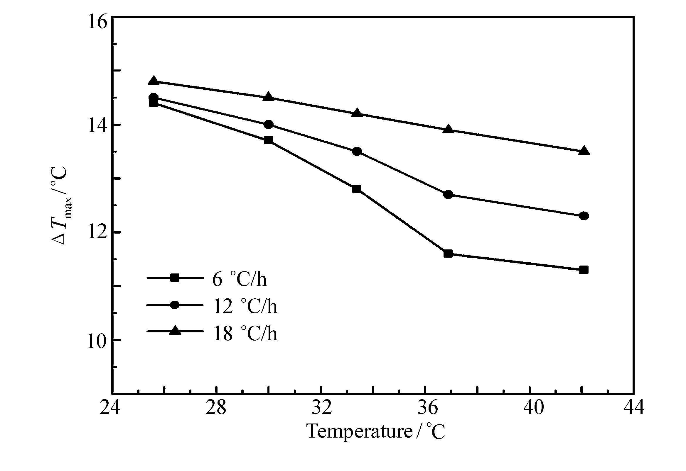 在固定200 r/min搅拌速率下,探究了不同降温速率:6 ℃/h、12 ℃/h及18 ℃/h下,相应的介稳区宽度,实验结果如图 4所示。由图 4可知,在实验温度范围内,同一个降温速率下,介稳区宽度随着温度的逐渐升高而减小;在同一个温度下,随着降温速率的增大,介稳区宽度变大;且随着温度的增大,降温速率对介稳区的影响逐渐增大。
