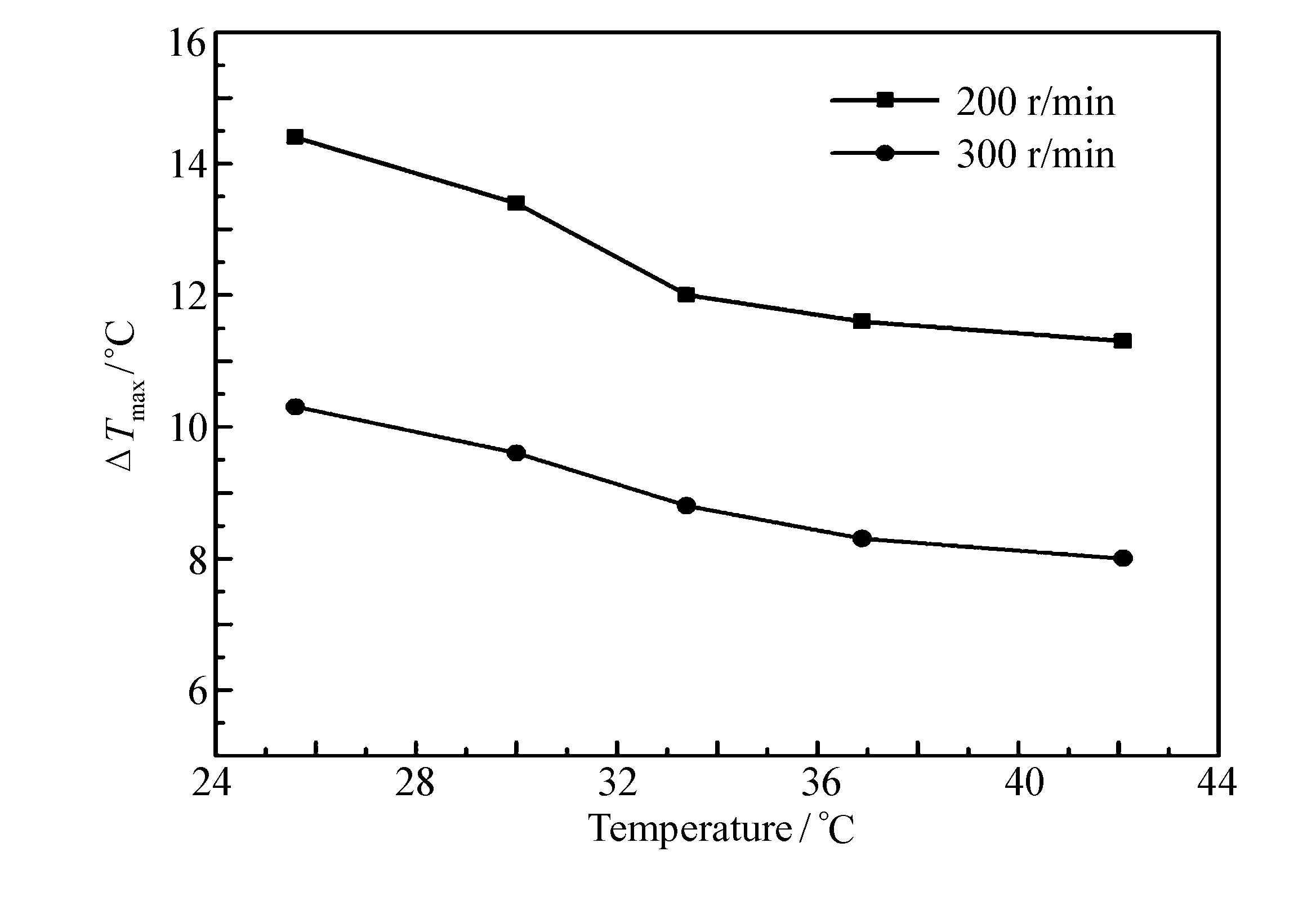 搅拌速率受结晶器结构和溶剂的体积大小影响,本实验在相同的搅拌桨结构和相同结晶器结构下,考察搅拌速率对介稳区的影响。图 5为固定降温速率为6 ℃/h,搅拌速率分别为200和300 r/min时,过硼酸钠结晶介稳区宽度的变化。由图 5可得,搅拌速率对过硼酸钠介稳区宽度影响较明显。相同温度下搅拌速率越高介稳区宽度越小。这是由于搅拌速率越大,过硼酸钠分子碰撞成核的几率就越大,传热速率也增大,使过饱和度下降介稳区变窄[13]。