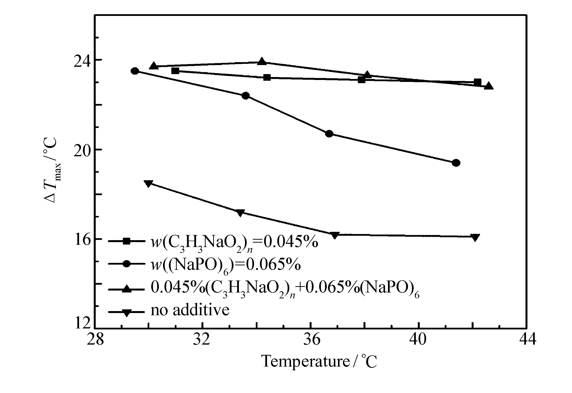 由于过硼酸钠制备过程中,两种添加剂是同时添加,共同对结晶过程产生影响。因此,研究两种添加剂在过硼酸钠结晶过程中交互作用十分必要。图 6为固定搅拌转速为200 r/min,降温速率24 ℃/h下,在纯水溶液中、单独添加0.065%六偏磷酸钠或添加0.045%聚丙烯酸钠以及共同添加0.065%六偏磷酸钠和0.045%聚丙烯酸钠条件下,过硼酸钠介稳区宽度变化。