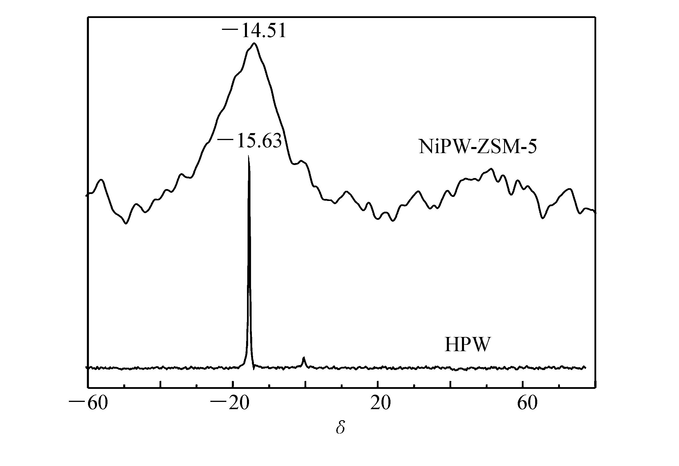 图 1为HPW和HZSM-5负载镍盐/HPW(NiPW-HZSM-5)催化剂的固体31P MAS-NMR的图谱。反应前HPW-HZSM-5催化剂的固体31P MAS-NMR的图谱结果表明,在δ -12.99处化学位移表明,1∶12系列Keggin结构HPW转化为Dawson结构的多阴离子[5]。而NiPW-HZSM-5催化剂仅存在δ -14.51一个化学位移,表明纳米HZSM-5负载HPW并结合Ni盐后的催化剂中HPW的Keggin骨架结构和Td对称性保持不变。向着高磁场频率的位移显示,HPW结合镍盐后和纳米HZSM-5沸石之间存在着强烈的相互作用,按照NiHPW12O40+M♡OH→(M)+((NiPW12O40)-+H2O,其中M=Si或Al的相互作用模式。