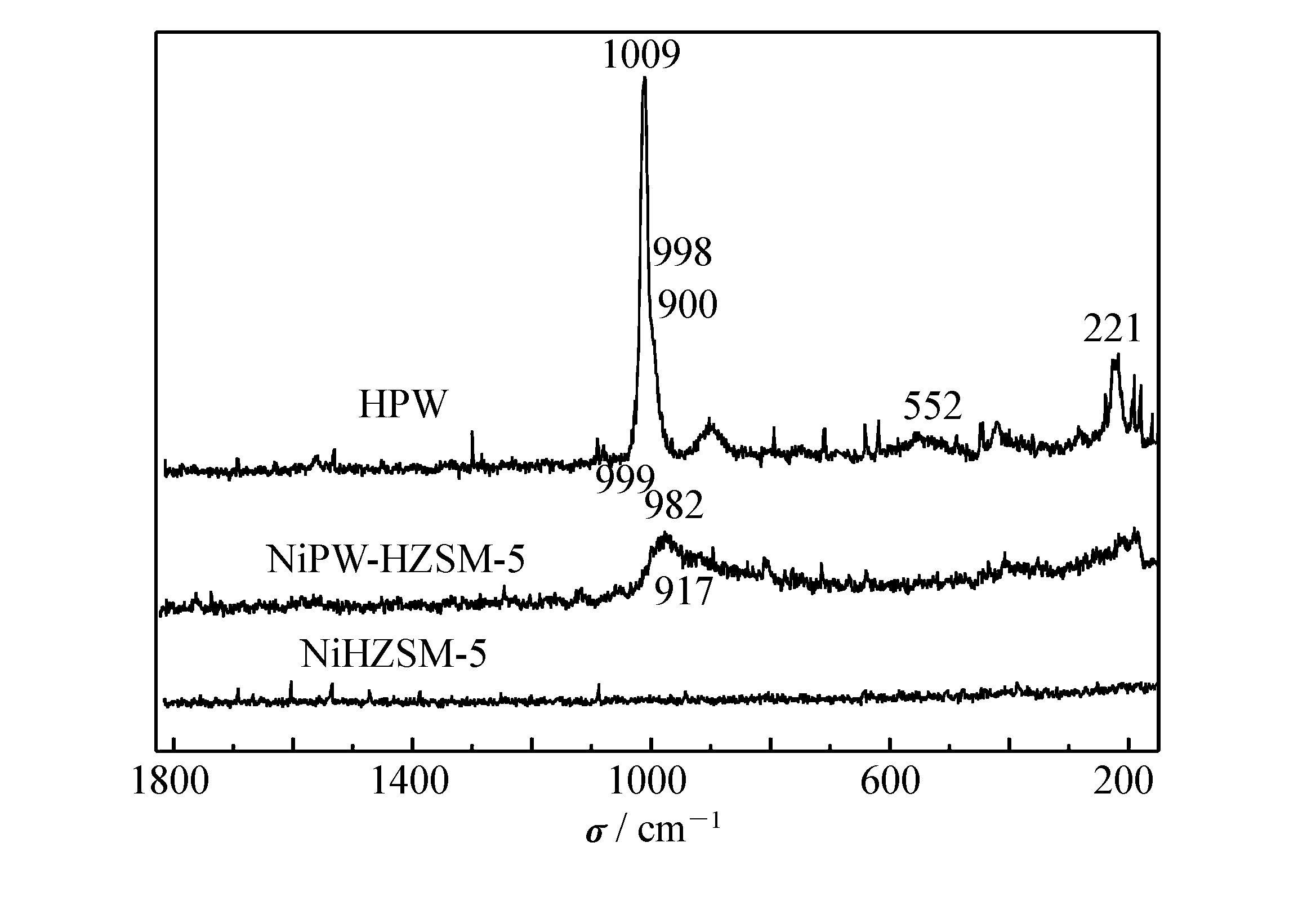 图 2为负载后催化剂的UV-Raman的图谱。HPW的峰在221、1009、998、、900和552 cm-1分别对应于W—O—W、P—Oa、W—Ot、W—Oc—W和O—P—O不同氧原子的特征振动[3]。NiHZSM-5催化剂没有表现出任何强的特征散射。而HPW-HZSM-5催化剂中,HPW的Keggin骨架结构发生部分或者完全坍塌,从而形成其它结构的多阴离子[5]。NiPW-HZSM-5催化剂在991、982和 817 cm-1处出现的强的振动信号是Keggin结构多阴离子HPW的特征振动。在552 cm-1处骨架振动特征峰的消失,可能是由于HPW在该处的振动较弱而被噪声所掩盖。这些特征键的化学位移表明,HPW和载体之间强烈的化学作用,而不是简单的物理吸附作用。