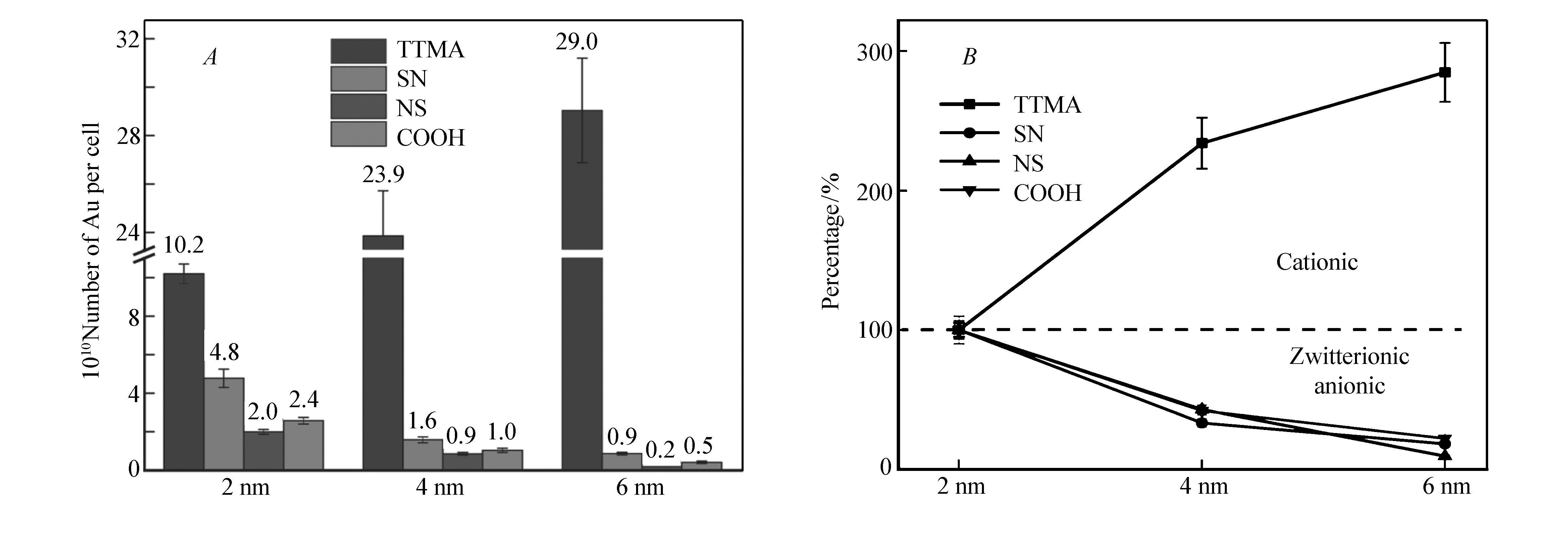 除此之外,还要考虑粒径、表面电荷二者对细胞吞噬AuNPs的共同影响。 Jiang等[60]考察了HeLa细胞对不同粒径(Dcore=2、4和6 nm)的AuNPs吞噬作用,结果发现HeLa细胞对电中性或荷负电的AuNPs的吞噬量随AuNPs粒径的增大而减少;而细胞对荷正电的AuNPs的吞噬量随其粒径的增大而增加(如图 3所示)。