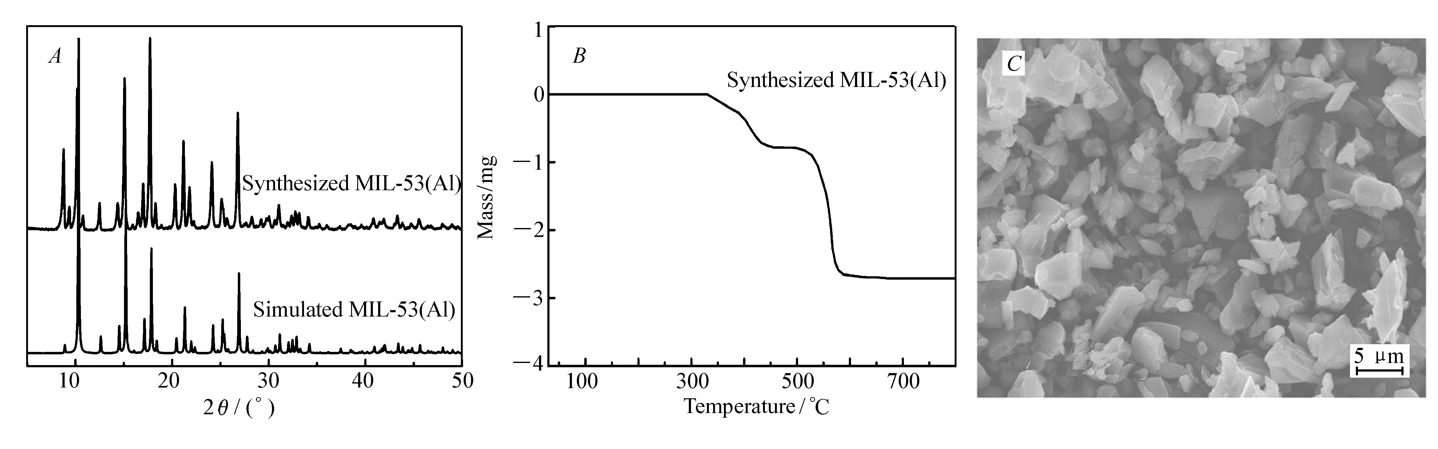 采用X射线粉末衍射(XRD)、热重分析(TGA)、扫描电子显微镜(SEM)和N2吸附实验对所合成的MIL-53(Al)进行表征。 对比模拟和实验所得的XRD谱图表明成功合成了MIL-53(Al)(图 1A)。 所合成的MIL-53(Al)即使在330 ℃下也可以稳定存在(图 1B),其粒径为3~4 μm(图 1C),BET比表面积为904 m2/g。